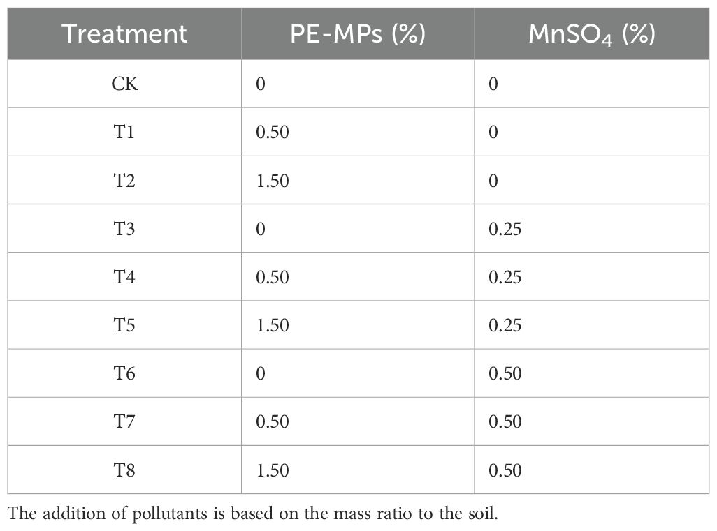 In the agricultural field system, the co-pollution of MPs and heavy metals (HMs) is particularly prevalent (Zhou et al., 2021). MPs in the soil can accelerate the migration rate of HMs in the soil, thus exacerbating the hazards posed by single-pollutant contamination (Medyńska-Juraszek and Jadhav, 2022). Some studies have revealed that MPs are capable of adsorbing substantial amounts of HMs in the soil, including arsenic (As), cadmium (Cd), chromium (Cr), copper (Cu), nickel (Ni), lead (Pb), and zinc (Zn) (Abbasi et al., 2020; Sarkar et al., 2021). They serve as transport vectors for the migration of HMs. Once reaching a certain concentration, MPs disperse HMs into the soil through the process of desorption. The pollution of MPs and HMs can remarkably impact the physicochemical properties of soil. Evidences from relevant research indicate that the sole addition of Cd may result in a decline in the soil pH, whereas the addition of polyethylene (PE) can give rise to an elevation in the pH (Wang et al., 2020a). The combined pollution of MPs and HMs exerts a remarkable inhibitory effect on soil organic matter, which is mainly attributed to its impact on the changes in the soil microbial community (Dong et al., 2021). The metabolic effects of the combined pollution on plant growth are achieved by influencing the physicochemical properties of the soil and the plants’ own physiological responses (Ziani et al., 2023). Studies have shown that the combined pollution of polyvinyl chloride (PVC) and Cr significantly reduced the biomass of sweet potatoes, and the combined pollution of PVC and Cd significantly damaged the photosynthetic system of cucumber seedlings (Li et al., 2020; Khan et al., 2023). As an essential trace element for plant growth, Mn is a key component of plant chlorophyll and plays an important role in photosynthesis and the activation of antioxidant enzymes. It is involved in plant metabolic processes, including oxygenic photosynthesis, respiration, and enzyme activation (Wang et al., 2023). Plants require only 20−40 mg/kg (dry weight) of Mn to sustain normal growth. An excessive amount of Mn can lead to plant toxicity. In many regions worldwide, Mn availability is a key limiting factor for crop productivity (Hou et al., 2022). When soybeans are subjected to Mn toxicity stress, their cellular defense mechanisms are activated, and the activities of corresponding antioxidant enzymes increase accordingly. In high-Mn environments, soybeans exhibit a variety of symptoms, including a reduction in root biomass and the inhibition of root development (Liu et al., 2023). The influence of Mn on plant growth is different from that of other HMs. Under the condition of combined pollution of MPs and Mn, the soil physical and chemical properties and plant growth status are a valuable research topic.