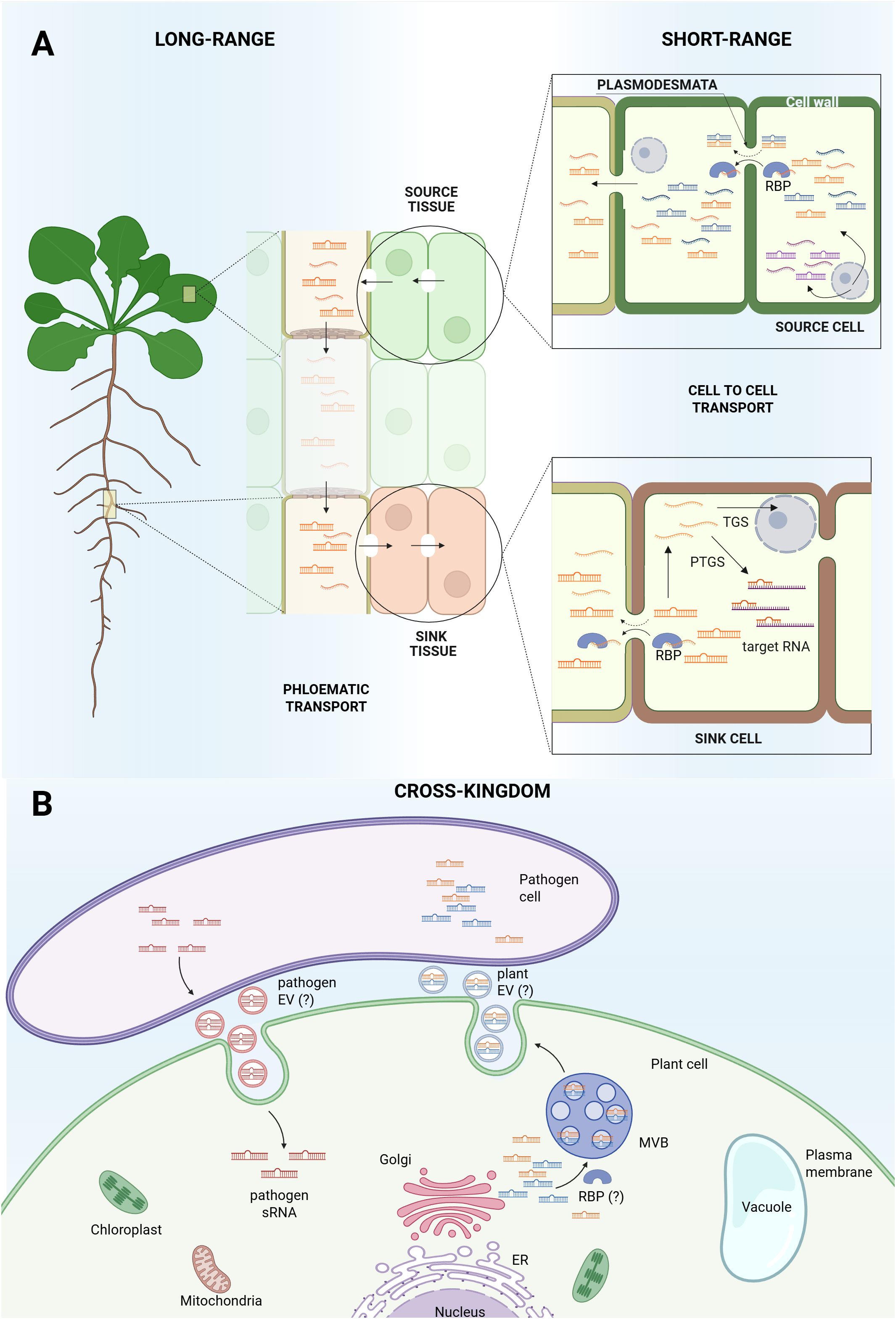 Figure 1. Small RNAs movement in Arabidopsis thaliana. (A) Biogenesis and movement of sRNAs within Arabidopsis plant. Some sRNAs are cell autonomous (represented in purple) while some sRNAs are produced by specific cells (source cell) and can move from one cell to another (sink cell), acting in a non-cell autonomous manner. sRNAs translocate from cell to cell through plasmodesmata, most probably as double strand sRNAs or as single strand sRNAs complexed with RNA-binding proteins (RBPs). Not all sRNAs seem to be systemically mobile (represented in blue), which supports the hypothesis that long-range movement through phloematic transport is restricted to specific RNA sequences (represented in orange) that act as mobile signals responsive to the plant’s physiological state. Once the sink cell is reached, sRNAs can interact with target RNA (PTGS) or enter the nucleus for TGS. (B) Cross-kingdom sRNAs transport. sRNAs present in the plant cytosol can be packaged into vesicles via the Golgi apparatus and secreted outside the cell, where they may be absorbed by plant pathogens. Pathogens can also generate sRNAs and deliver them into plant cells to modulate host gene expression. The question mark (“?”) indicates areas that remain unresolved, specifically, whether plants produce extracellular vesicles (EVs), whether other organisms can release EVs, and whether RBPs are involved in sorting sRNAs into EVs.