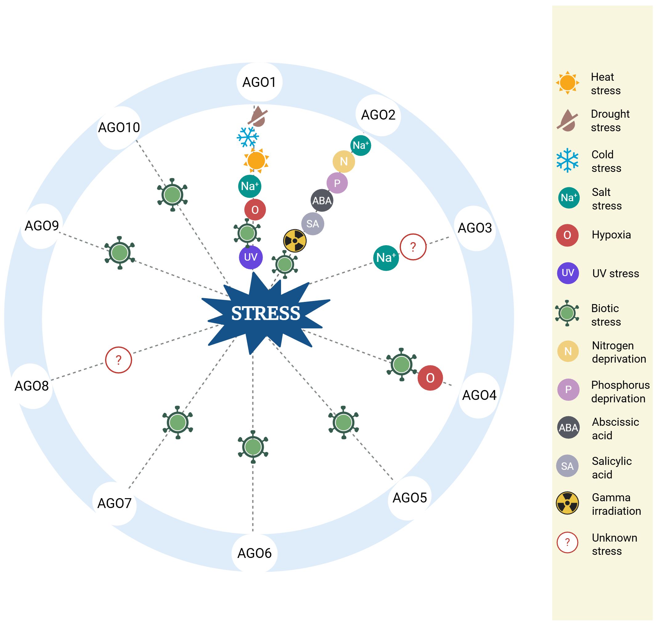 Figure 2. Biological roles of AGO proteins under various stress conditions. The diagram summarizes the role of specific AGO proteins in diverse stress responses in Arabidopsis. Each AGO is linked to one or more types of stress, including heat, drought, cold, salinity, hypoxia, UV exposure, nutrient deprivation, pathogen infection, hormone exposure, and gamma irradiation. The depicted associations are supported by experimental findings discussed in the main text. Full reference details for each stress-related function are provided in the corresponding sections of this review.