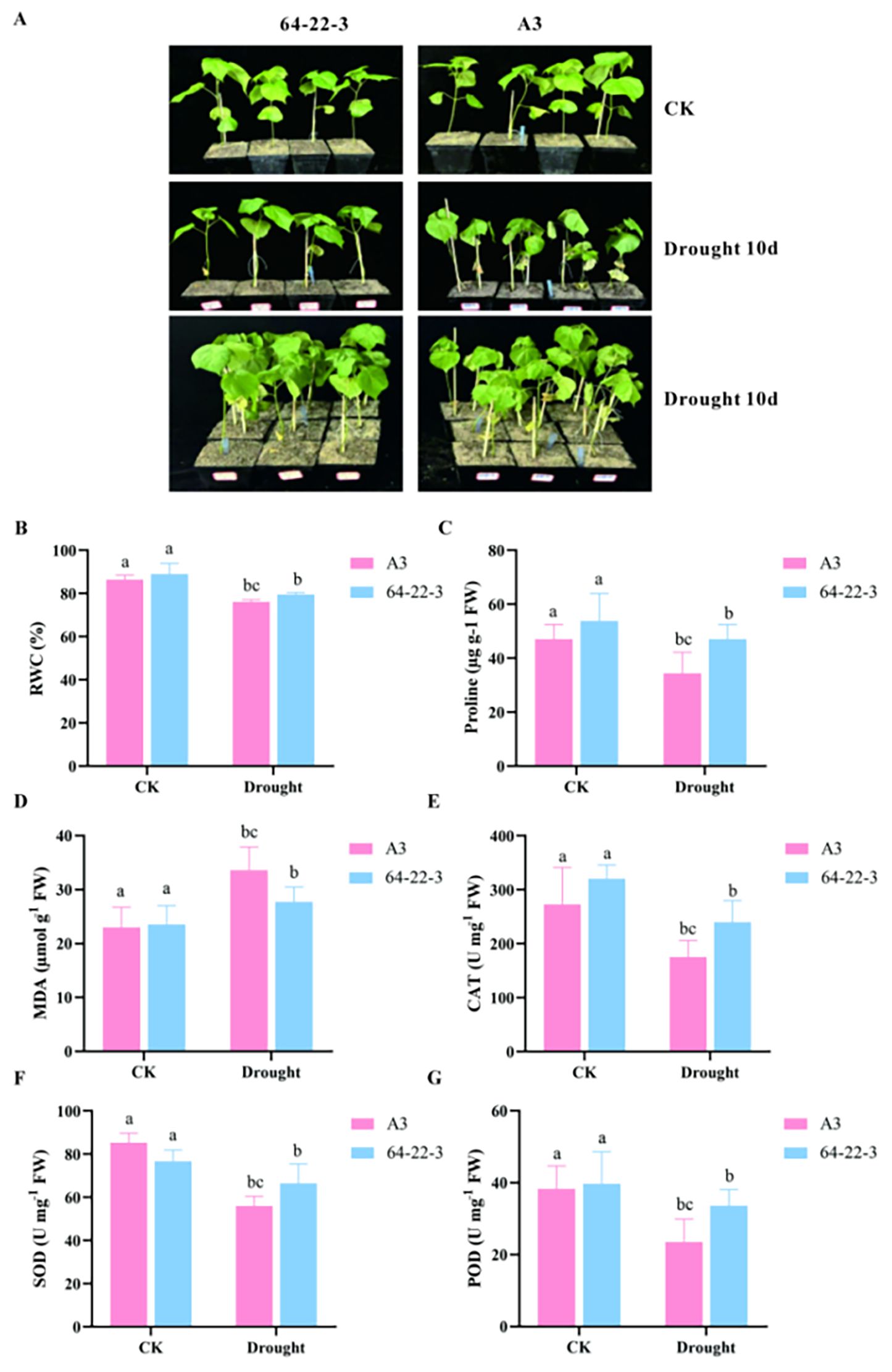 Figure 2. Phenotypic and physiological characterization of cotton under normal irrigation and drought conditions. Different lowercase letters indicate significant differences among treatment groups at p < 0.05 level. (A) Phenotypic comparison between normally irrigated and drought-stressed cotton plants; (B) Leaf relative water content (RWC, %) in control and drought-treated groups; (C) Proline content (Pro) under normal irrigation and drought stress; (D) Malondialdehyde content (MDA) in control and drought-exposed plants; (E) Catalase (CAT) activity in cotton under well-watered and drought-stress conditions. (F) Superoxide dismutase (SOD) content in cotton under well-watered and drought-stress conditions. (G) Peroxidase (POD) activity in cotton under well-watered and drought stress conditions.