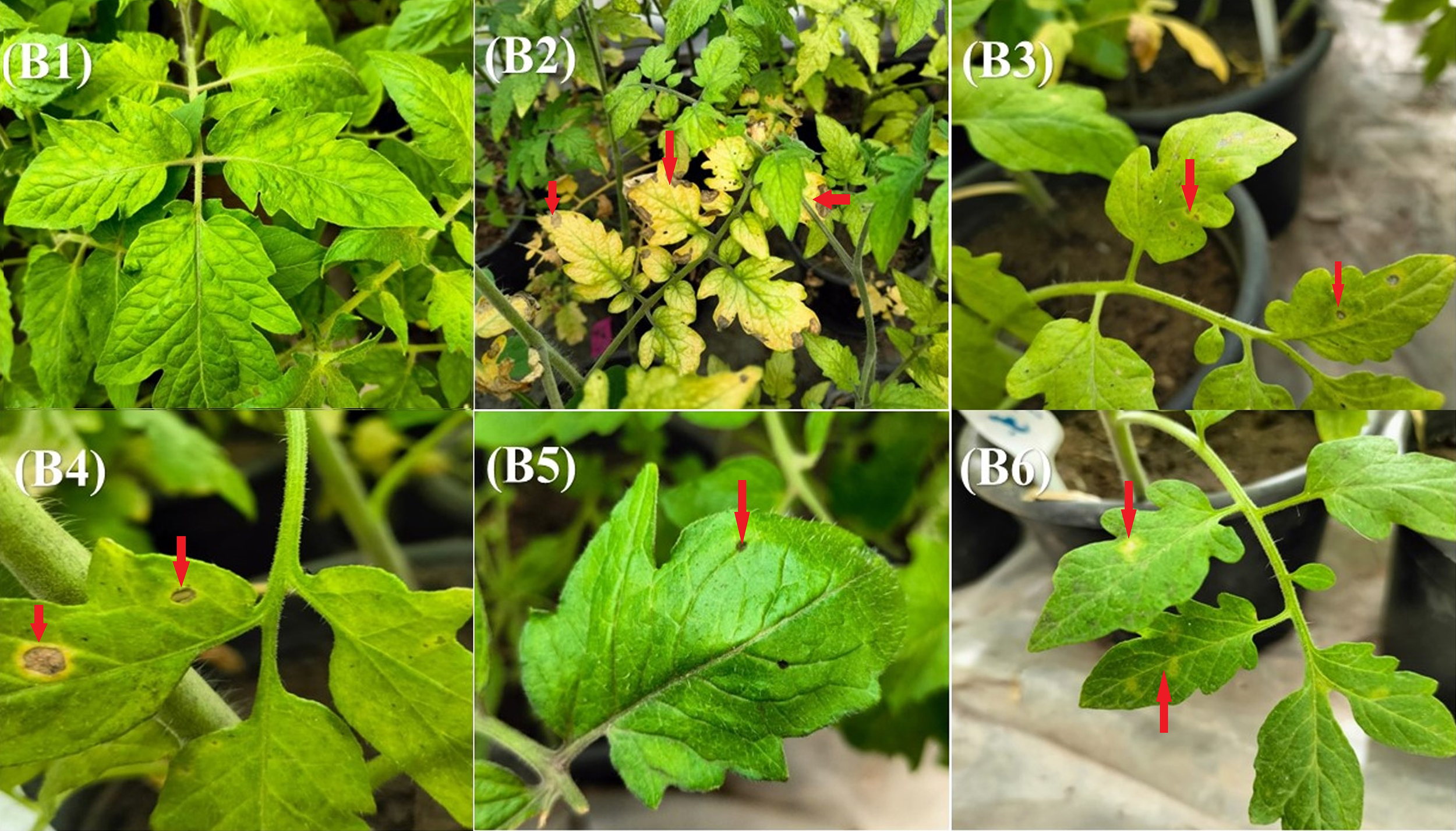 Figure 5. Impact of various treatments on disease incidence and severity in Alternaria-infected plants under greenhouse conditions. B1 – healthy untreated control plants; B2 – plants inoculated with Alternaria pathogen only; B3 – plants sprayed with plant extract (RD) 48 hours after Alternaria inoculation; B4 – plants treated with ethyl acetate extract of Trichoderma isolate Ham34–48 hours after pathogen inoculation; B5 – plants treated with a mixture of RD extract and Ham34 ethyl acetate extract 48 hours after inoculation and B6 – plants treated with Ridomil Gold® fungicide 48 hours after Alternaria inoculation. The red arrows indicate the leaf spot symptoms caused by Alternaria in the different treatments.