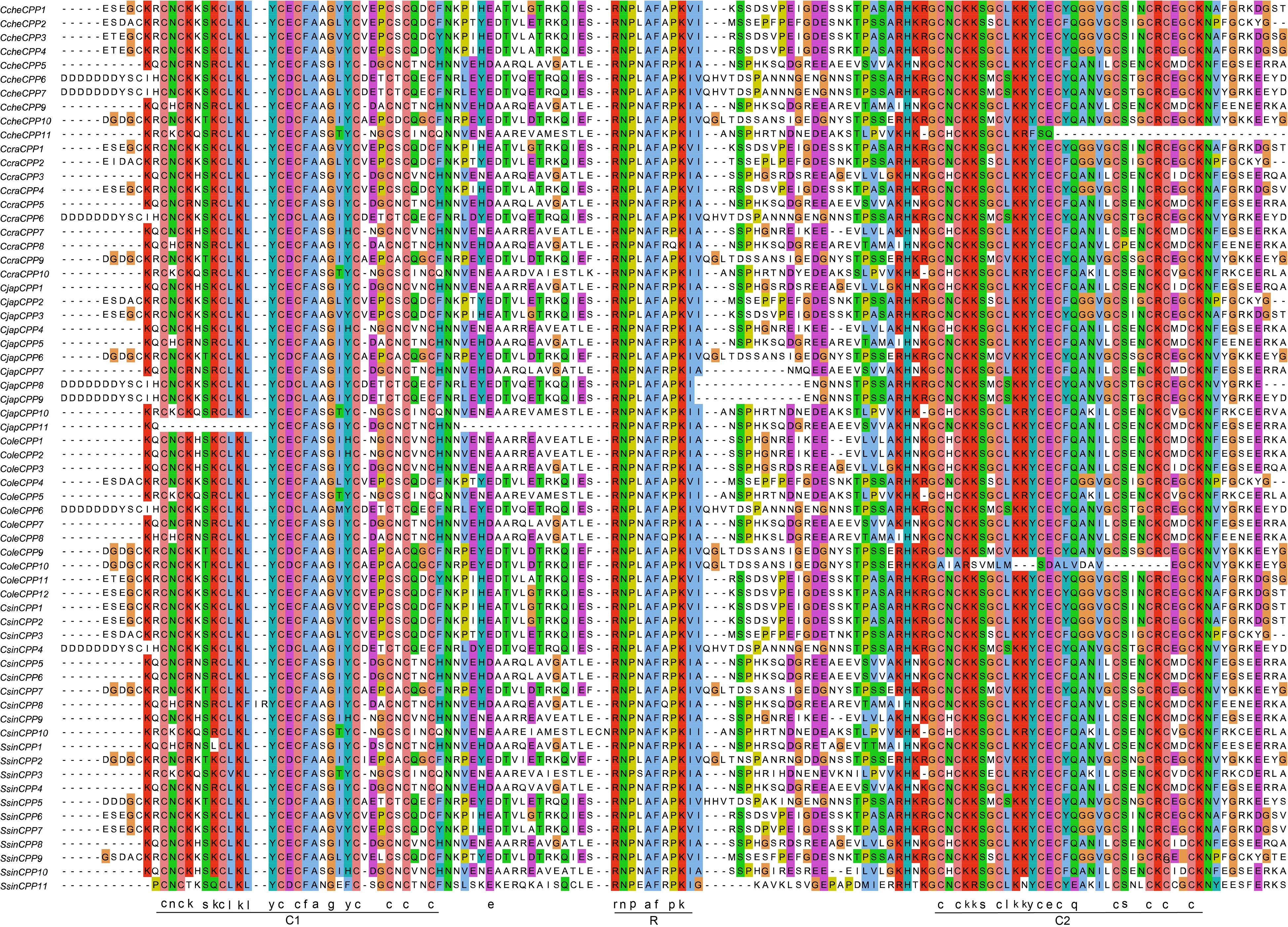 Furthermore, one highly conserved R motif (RNPXAFXPK) located in the interval between C1 and C2, further underscores the conservation within the CPP family proteins. This motif maintained in the vast majority of CPP proteins, with only CcraCPP8 had one mutation with proline (P) replaced by a glutamine (Q). This suggested that the motif was equally important in maintaining the structural integrity of CPP proteins and their functional regulation.