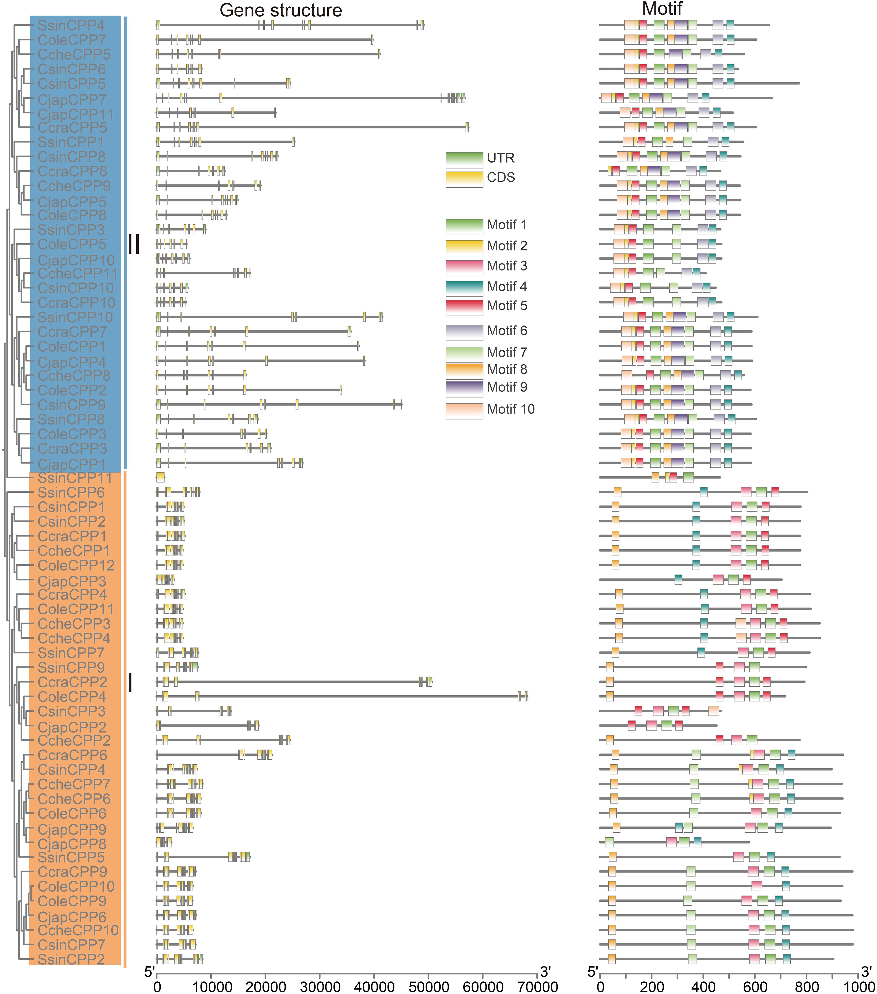 Figure 3. Gene structure and motifs analysis of the CPP gene family in Theaceae. On the left side is phylogenetic tree of CPP genes. Middle side is gene structure and motifs were in the right.