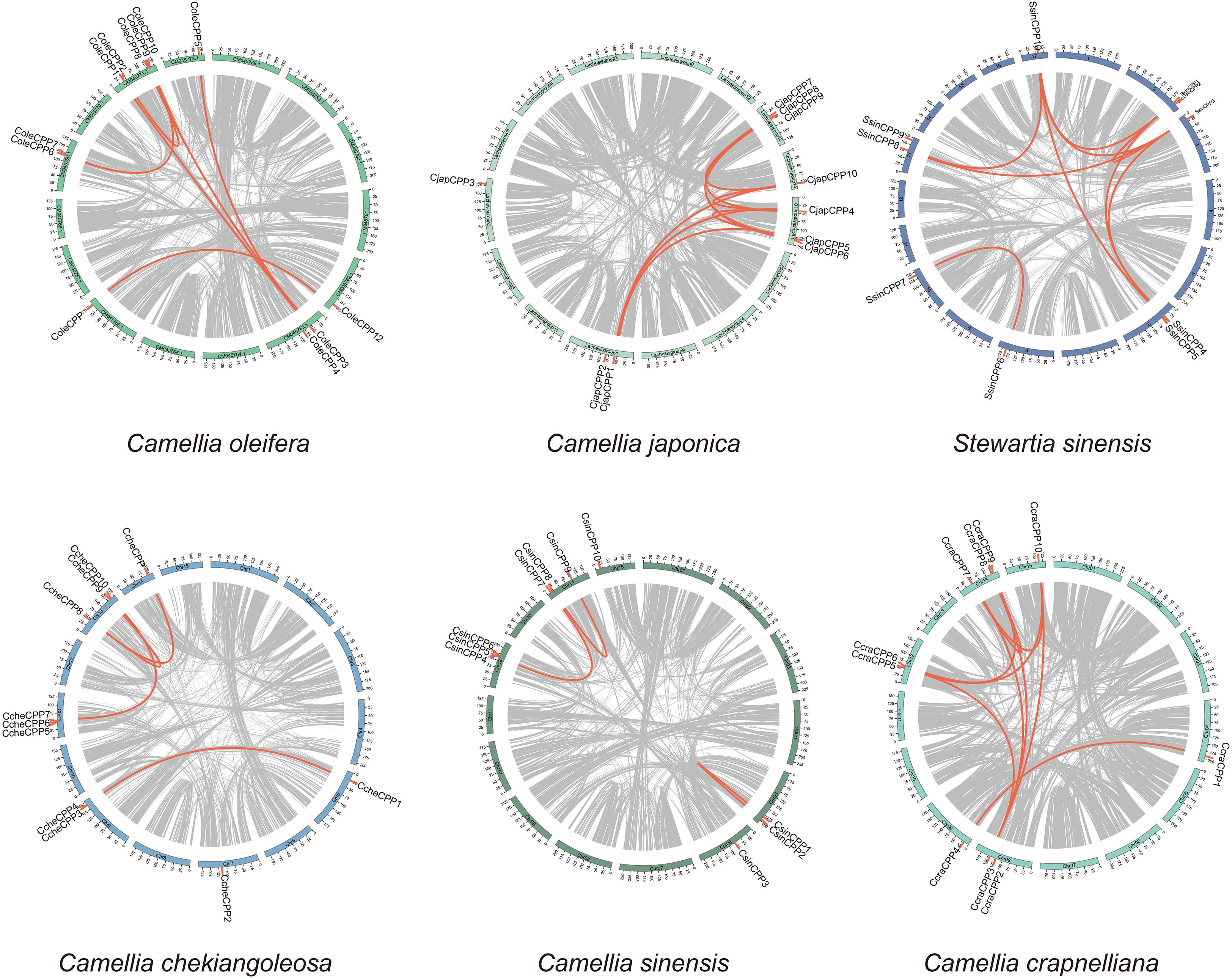 Figure 4. Collinearity analyses of CPP gene family in six Theaceae plants. Red links highlight segmental duplication of CPP gene pairs.