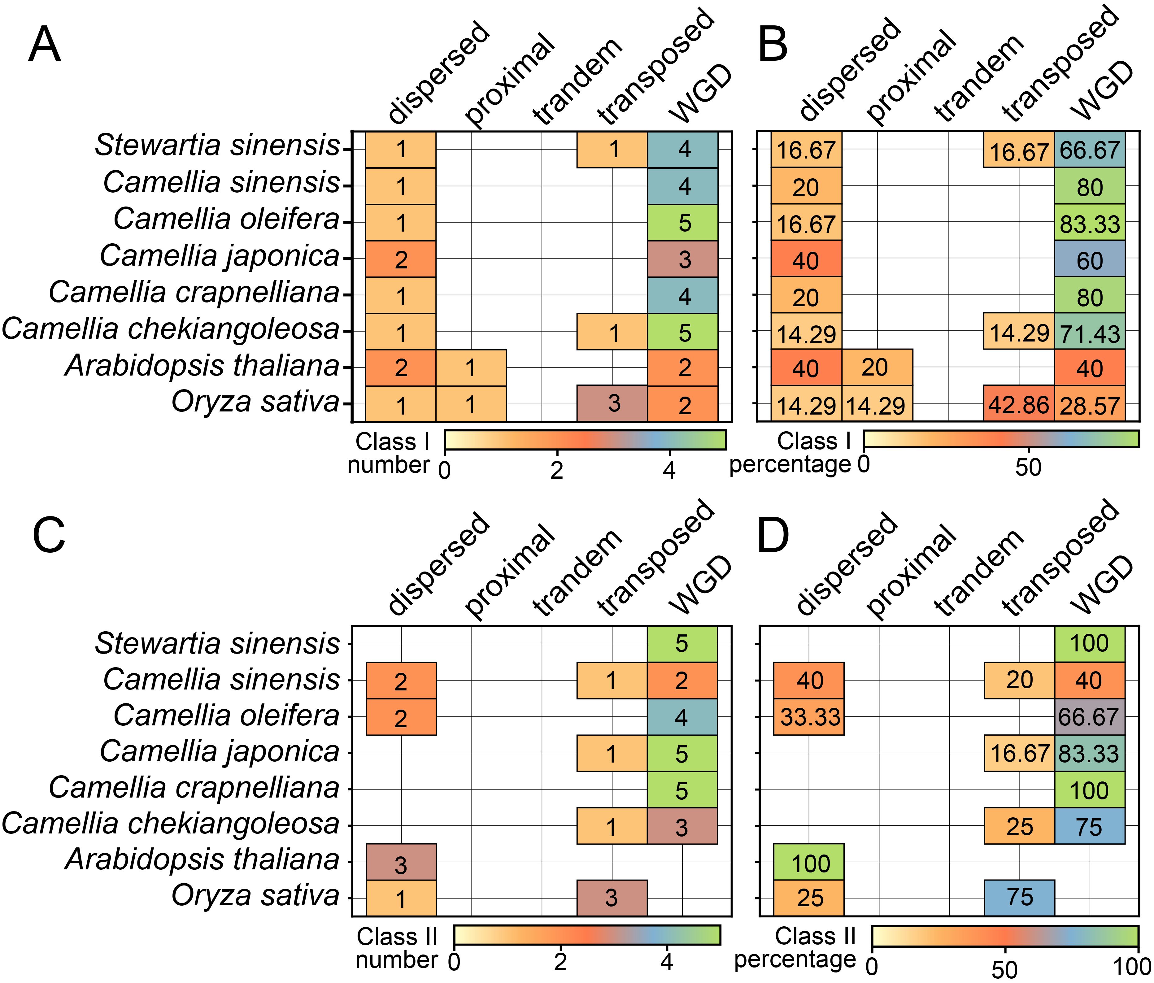 Figure 5. The distribution of CPP genes derived from various duplication modes. The number (A) and percentage (B) distributions from class I CPP genes. The number (C) and percentage (D) distributions from class II CPP genes.