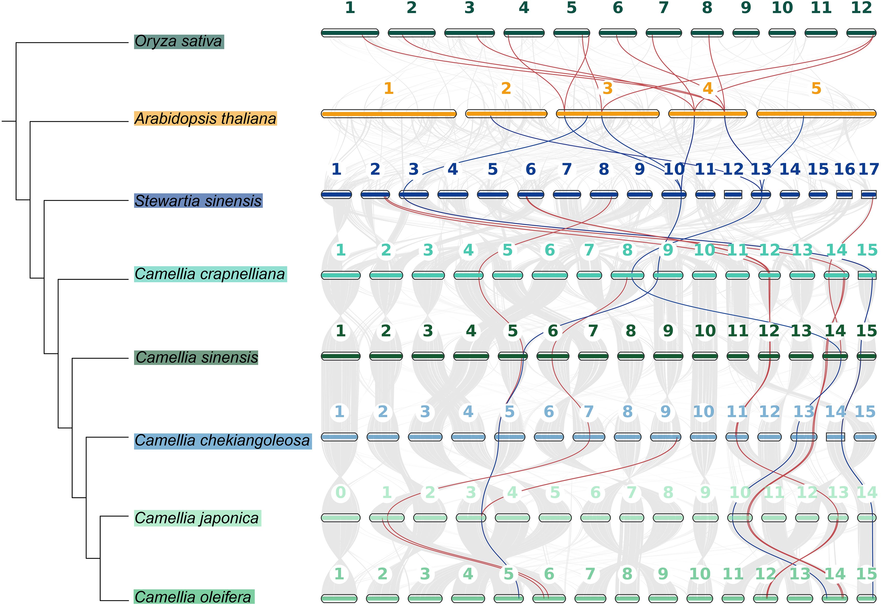 Figure 6. The collinearity analysis of CPP family genes across six Theaceae and A.thaliana and Oryza sativa. Red lines represent collinear CPP gene pairs between Theaceae and two other species and the distinctive blue lines indicate genes that exhibit collinearity with A. thaliana.