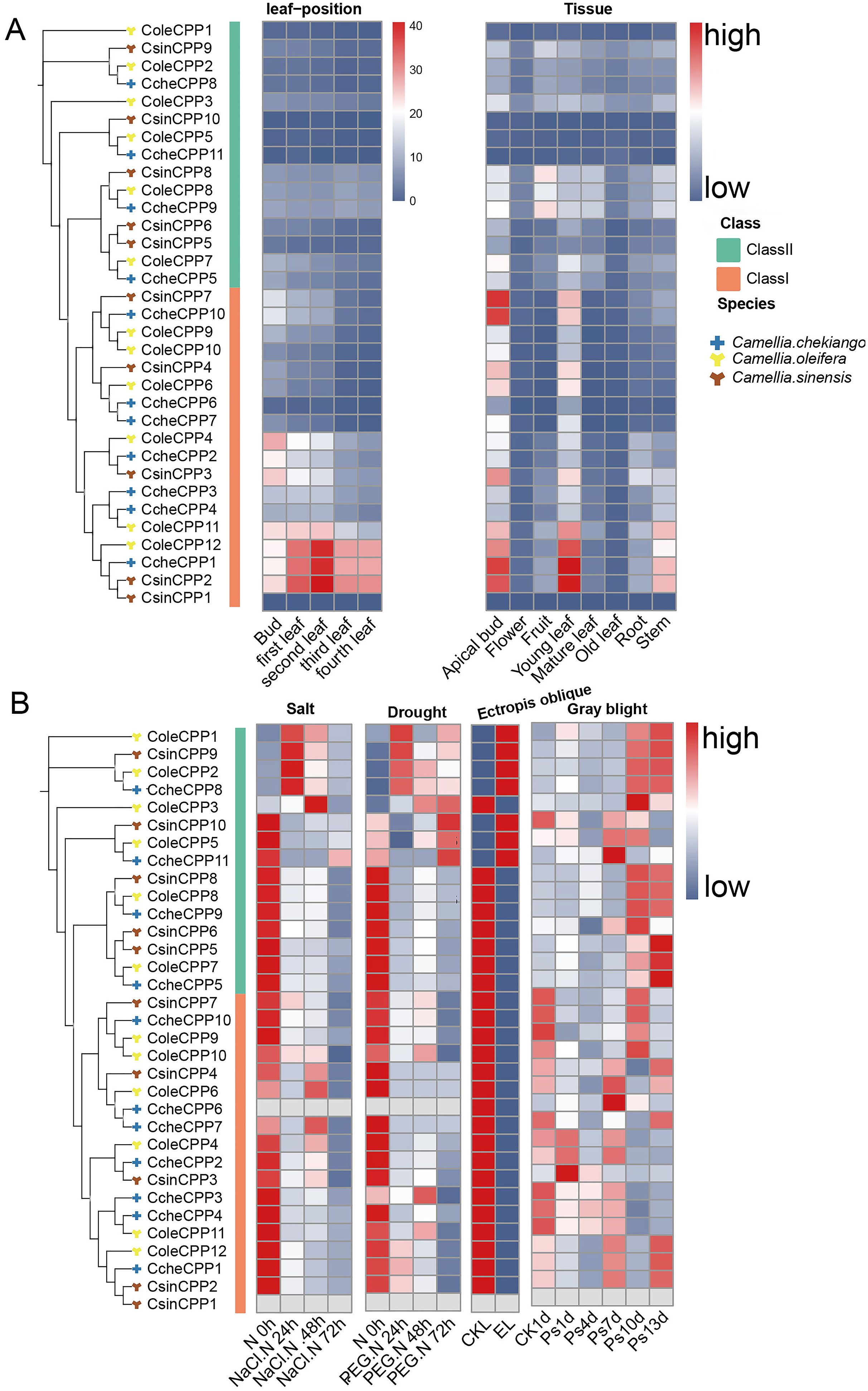 Figure 8. Expression of CPP genes in under different tissues and stresses treatment in three Theaceae plants. The left side features an evolutionary tree, while the right side displays an expression heatmap. Genes designated with Cole prefix correspond to C. oleifera, Cche is C. chekiangoleos, Csin is C. sinensis. (A) for different tissues and (B) for different stress treatment.