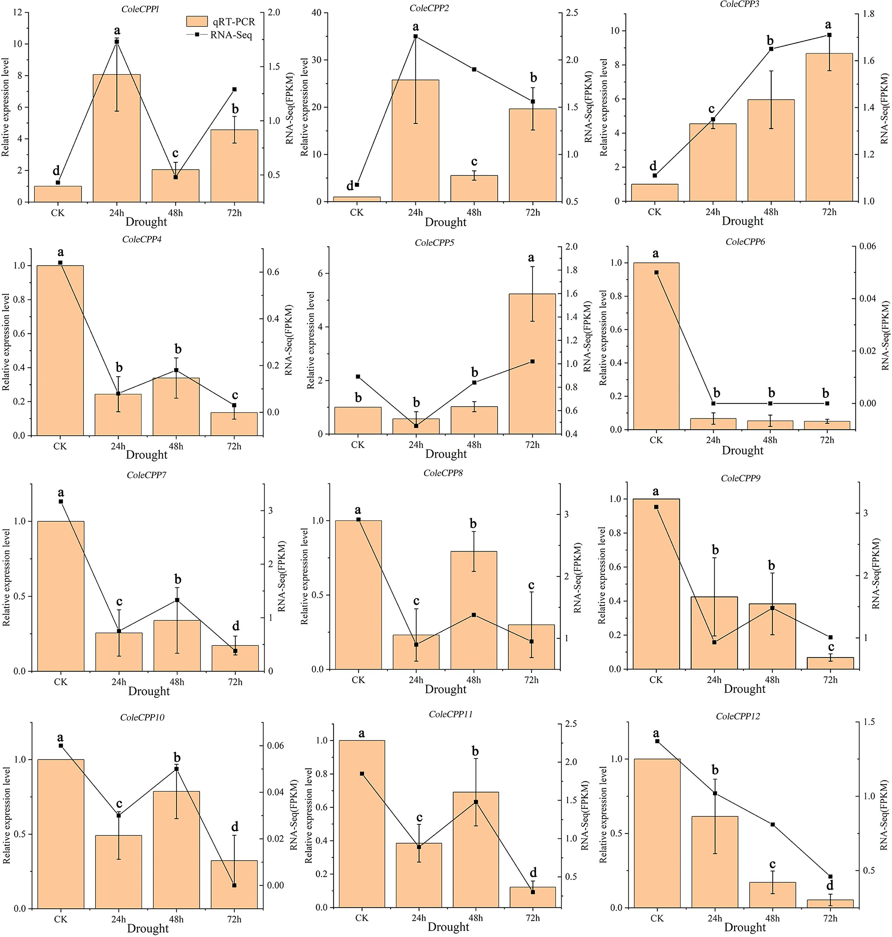 Figure 9. Relative expression patterns of the CPP gene family under drought stress in camellia oleifera. The bar chart represents the qRT-PCR quantification results, while the line chart represents the transcriptome quantification results. Data were the mean of 3 independent biological replicates. Different letters above the bar chart indicated significant differences at P < 0.05. (Error bars indicate the standard error (SE) between three replicates).