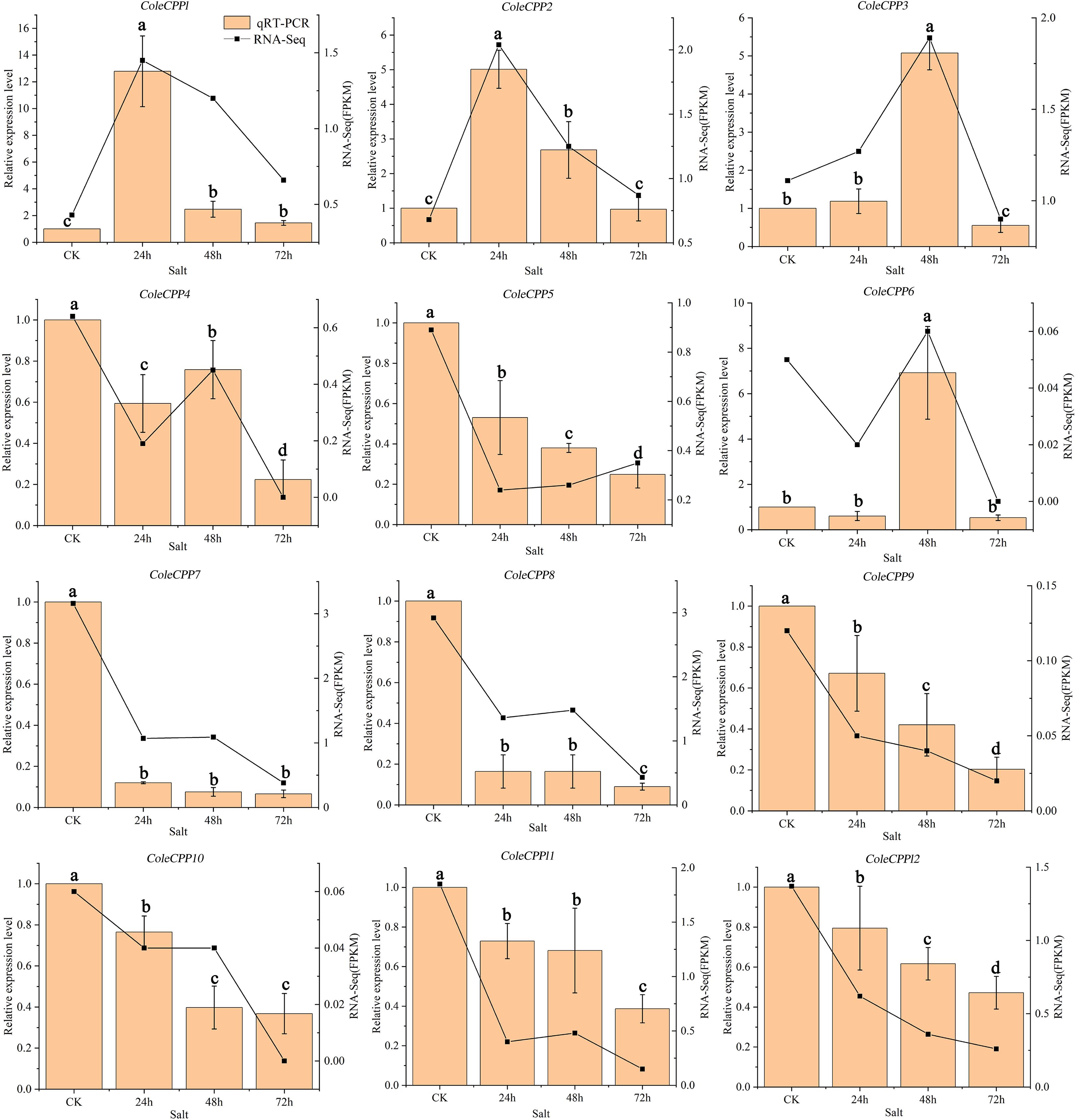 Figure 10. Relative expression patterns of the CPP gene family under salt stress in camellia oleifera. The bar chart represents the qRT-PCR quantification results, while the line chart represents the transcriptome quantification results. Data were the mean of 3 independent biological replicates. Different letters above the bar chart indicate significant differences at P < 0.05(Error bars indicate the standard error (SE) between three replicates).