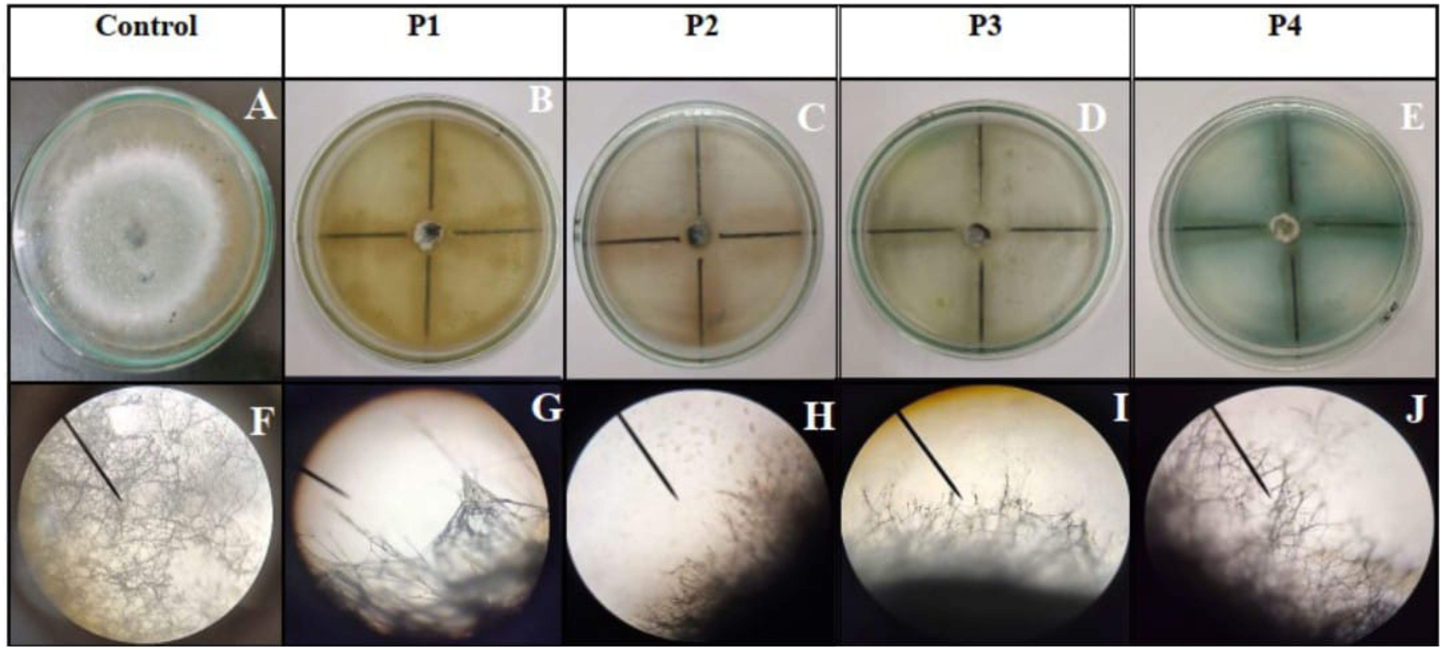 Five petri dishes labeled Control, P1, P2, P3, and P4 show varying levels of fungal growth with Control having the densest growth. Below each, microscope views labeled F to J reveal the internal fungal structures, with noticeable variances in density and branching patterns among the samples.