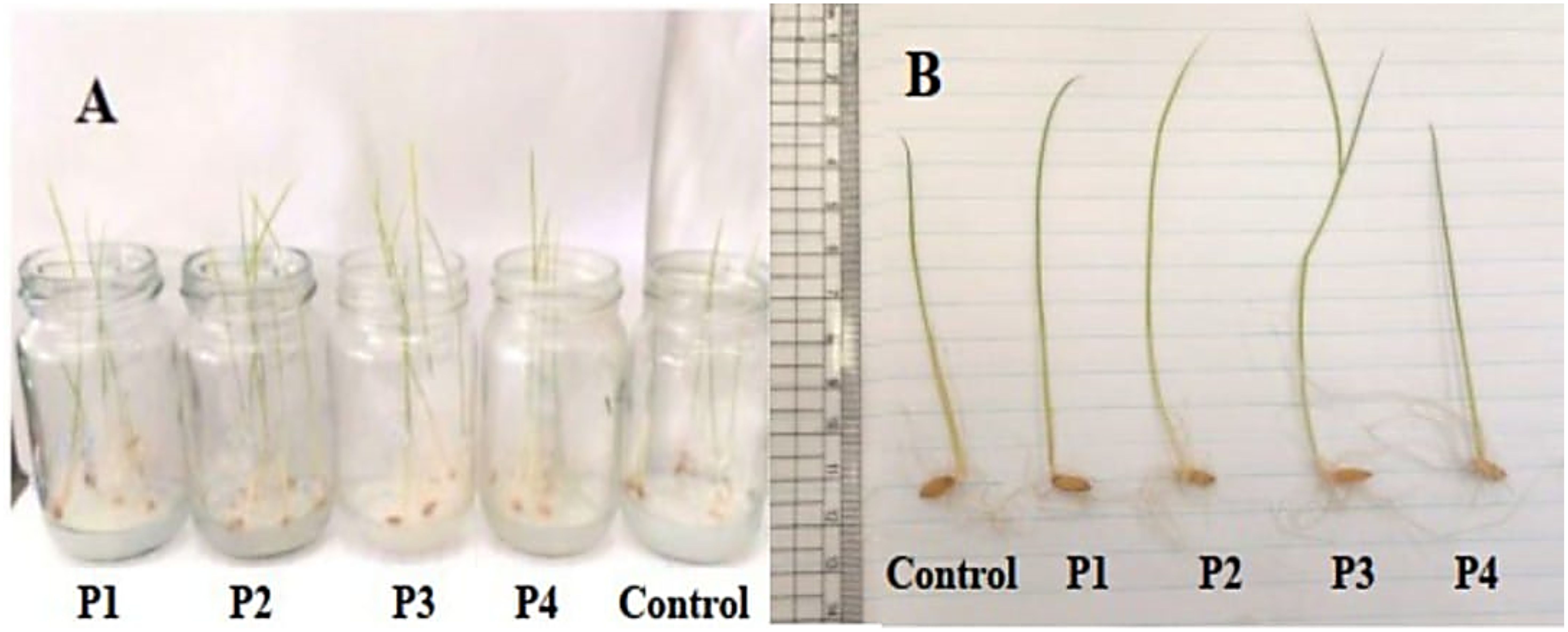 Figure 4. Growth promotion of rice seedlings by bacterial isolates in agarose medium. (A) Rice seedlings grown in glass jars containing 0.7% agarose, inoculated with P1–P4, compared with the uninoculated control. (B) Comparative seedling morphology showing enhanced shoot and root elongation in bacteria-treated plants (P1–P4) relative to the control.