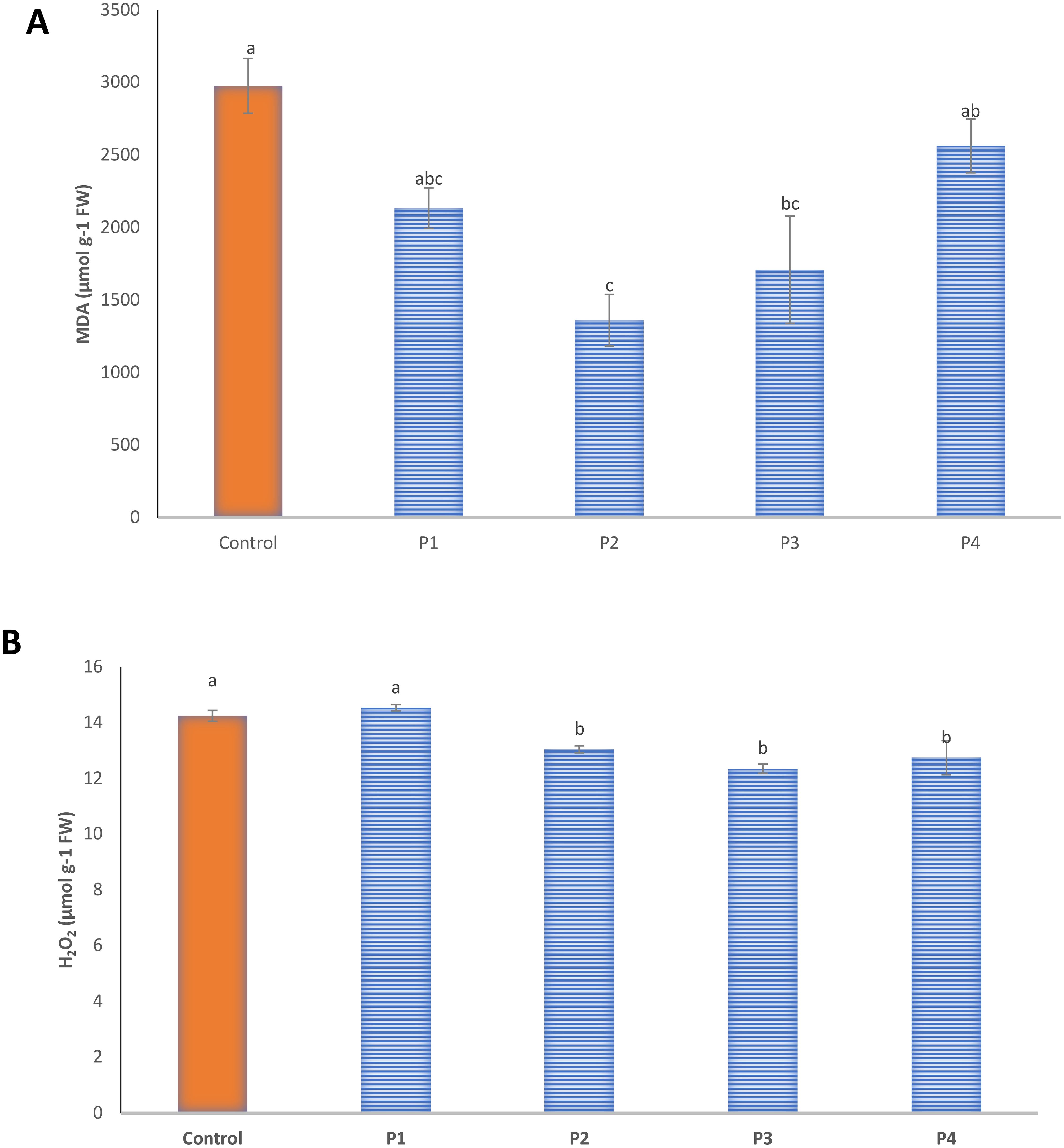 Hydrogen peroxide (H2O2) and malondialdehyde (MDA) contents were quantified as indicators of oxidative stress using the methods described by Velikova et al. (2000) and Heath and Packer (1968), respectively, with minor modifications to standardize the procedures. For H2O2 quantification, 0.1 g of fresh leaf tissue was homogenized in 5 mL of ice-cold 0.1% (w/v) trichloroacetic acid (TCA) and centrifuged at 12,000 × g for 15 min at 4°C. The reaction mixture contained 0.5 mL of the supernatant, 0.5 mL of 10 mM potassium phosphate buffer (pH 7.0), and 1 mL of 1 M potassium iodide (KI). Absorbance was measured at 390 nm using a UV–VIS spectrophotometer (Shimadzu UV-1800, Japan). For MDA estimation, 0.1 g of fresh leaf tissue was homogenized in 5 mL of 5% (w/v) TCA and centrifuged at 10,000 × g for 10 min. To 2 mL of the resulting supernatant, 2 mL of 0.67% (w/v) thiobarbituric acid (TBA) prepared in 20% (w/v) TCA was added. The mixture was heated at 95°C for 20 min in a water bath and then rapidly cooled on ice to terminate the reaction. The absorbance of the supernatant was measured at 532 and 600 nm.