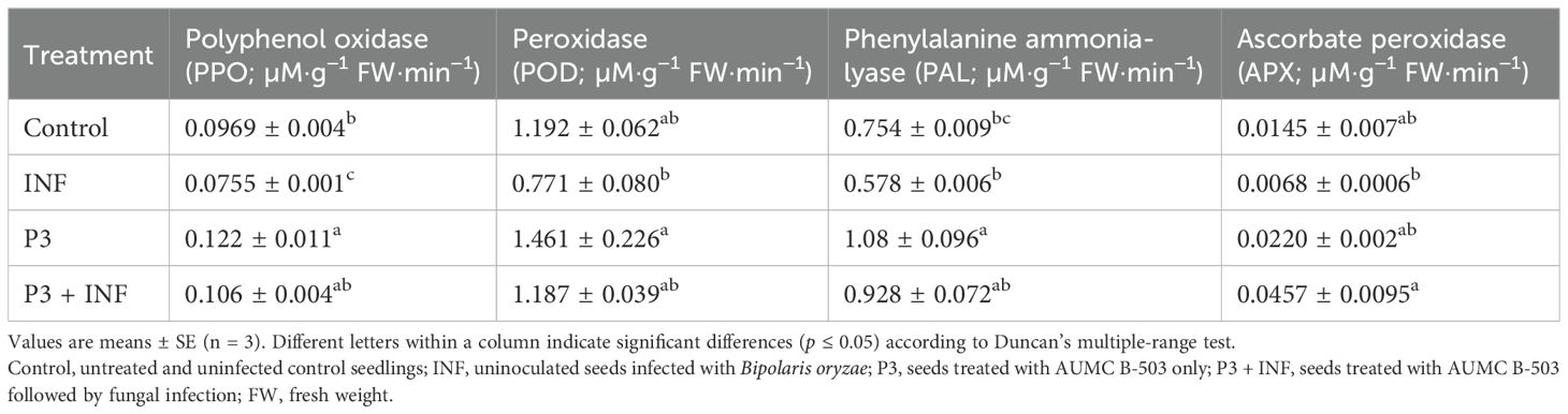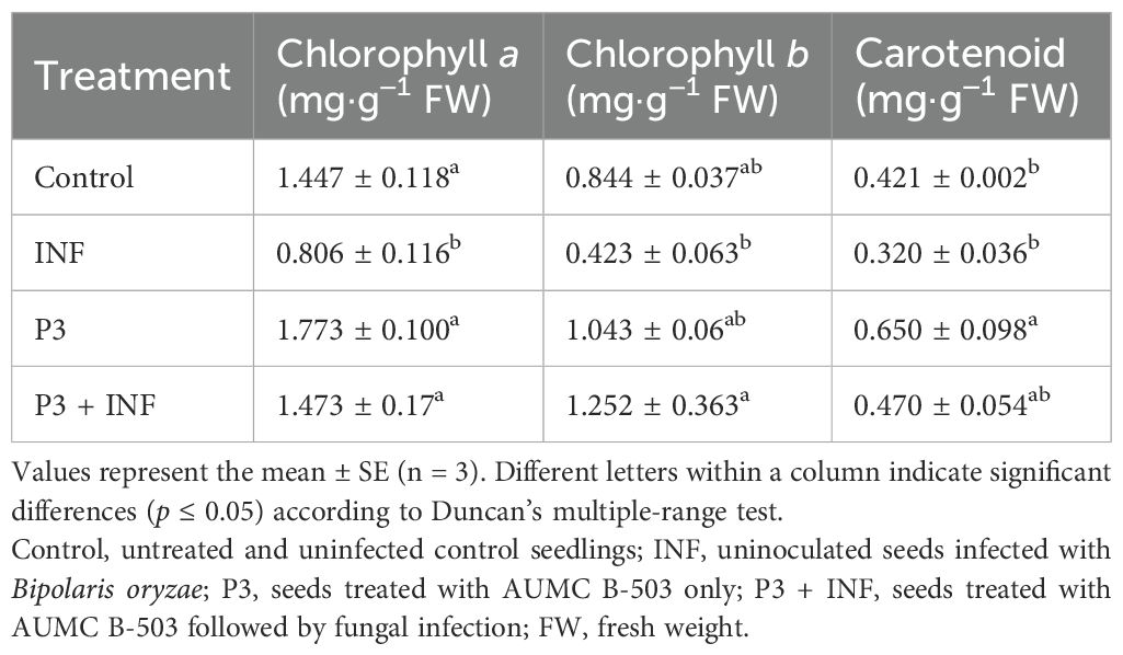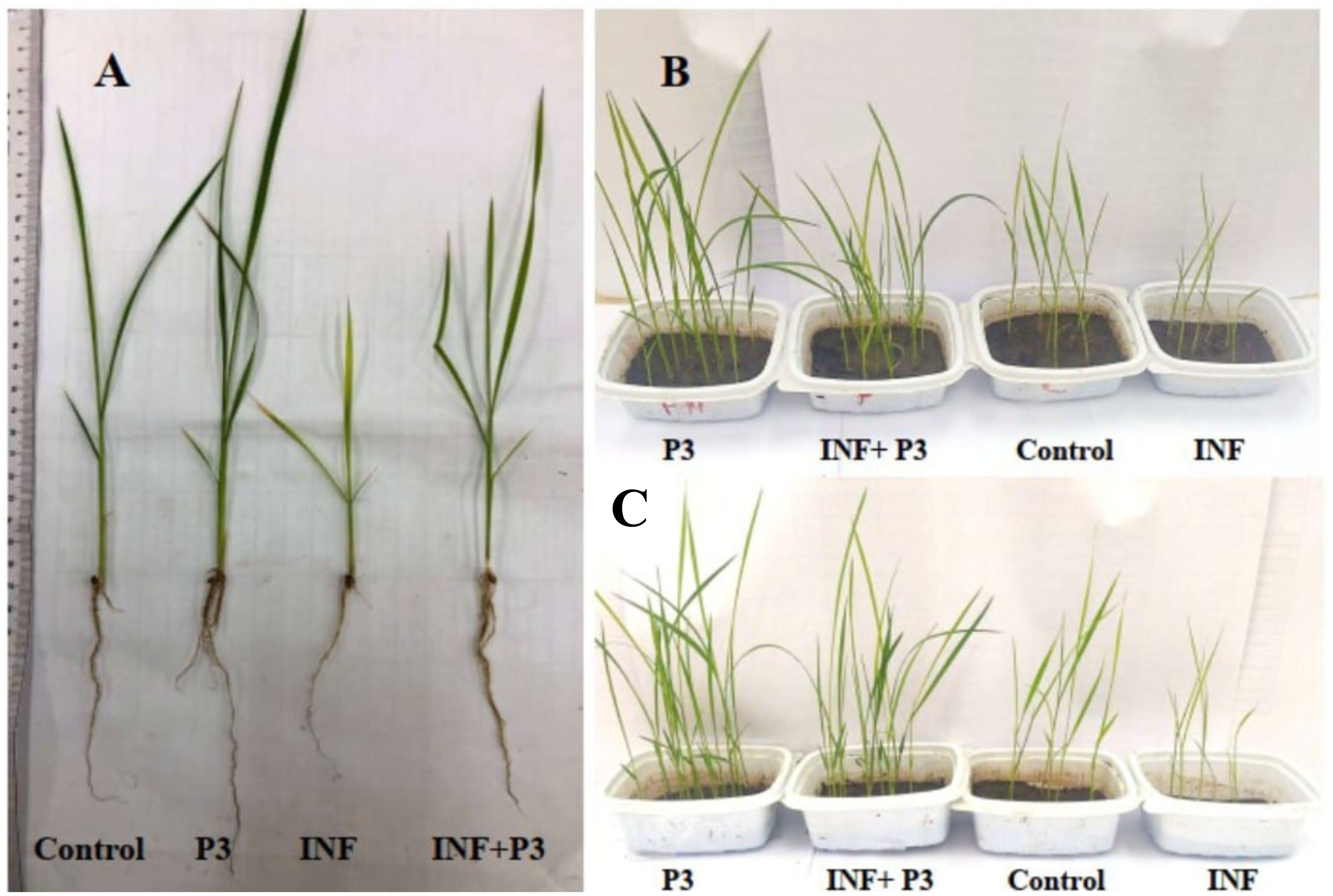 Pathogen inoculation was performed at the 14-day seedling stage by spraying 10 mL of a B. oryzae spore suspension (1 × 107 spores·mL−1) evenly over each pot. Immediately after inoculation, plants were maintained under high relative humidity (approximately 100%) for 48 h by covering the pots with transparent polyethylene bags to facilitate conidial germination and successful infection. This experimental design comprised four treatments: i) untreated and uninfected control seedlings, ii) seeds treated only with the P3 isolate, iii) uninoculated seeds infected with B. oryzae (INF), and iv) seeds treated with the P3 isolate followed by fungal infection (P3 + INF).
