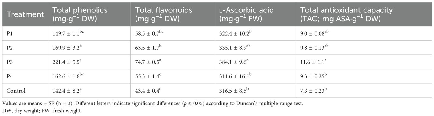 Total phenolic content (TPC) was determined using the Folin–Ciocalteu method (Jindal and Singh, 1975). An aliquot (0.2 mL) of the ethanolic extract was mixed with 1 mL of 10% (v/v) Folin–Ciocalteu’s reagent and 0.8 mL of 7.5% (w/v) Na2CO3 solution. The mixture was incubated for 60 min at room temperature in the dark, and absorbance was measured at 650 nm. Gallic acid (0–1 mg·mL−1) was used to prepare the calibration curve (R2 = 0.9948). The limit of detection was 0.02 mg·mL−1. Results were expressed as mg gallic acid equivalents (GAE)·g−1 DW. The total flavonoid content (TFC) was measured according to the method described by Chang et al. (2002). The assay mixture consisted of 0.5 mL of ethanolic extract, 0.1 mL of 10% (w/v) AlCl3, 0.1 mL of 1 M potassium acetate, and 4.3 mL of 95% ethanol. After incubation for 30 min at room temperature, the absorbance was recorded at 417 nm. Quercetin (0–1 mg·mL−1) served as the standard for calibration (calibration curve R2 = 0.8677). The limit of detection for the TFC was 0.05 mg·mL−1, and the results were expressed as mg quercetin equivalents (QE)·g−1 DW. Ascorbic acid content was quantified according to Omaye et al. (1979). Fresh leaf tissue (0.1 g) was homogenized in 5% (w/v) sulfosalicylic acid and centrifuged at 10,000 × g for 10 min. The reaction mixture consisted of 1.5 mM Na2HPO4, 0.15 N H2SO4, 2% (w/v) ammonium molybdate, and 0.5 mL of supernatant. The mixture was incubated at 60°C for 40 min and then cooled to room temperature. Absorbance was then measured at 660 nm. A standard calibration curve of l-ascorbic acid (0–5 mg·mL−1, R2 = 0.9956) was used for quantification, and results were expressed as mg ascorbic acid equivalents·g−1 FW. Total antioxidant capacity (TAC) was assessed using the phosphomolybdenum method (Prieto et al., 1999). The reagent was prepared by mixing 0.6 M H2SO4, 28 mM Na2HPO4, and 4 mM ammonium molybdate in a 1:1:1 ratio. The reaction mixture consisted of 1 mL of TAC reagent and 100 µL of ethanolic extract, which was incubated at 95°C for 90 min and then cooled to room temperature. Absorbance was read at 765 nm. Ascorbic acid (0–4 mg·mL−1) was used as the reference standard (calibration curve R2 = 0.9912). The limit of detection for TAC was 0.03 mg·mL−1, and results were expressed as mg ascorbic acid equivalents·g−1 DW. All spectrophotometric measurements were performed in triplicate, and results were presented as mean ± standard error.
