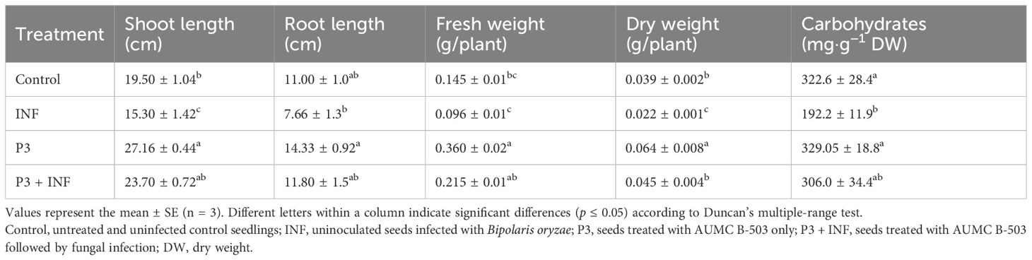 Table 2. Growth parameters and total soluble carbohydrates of rice seedlings treated with bacterial isolates (P1–P4).