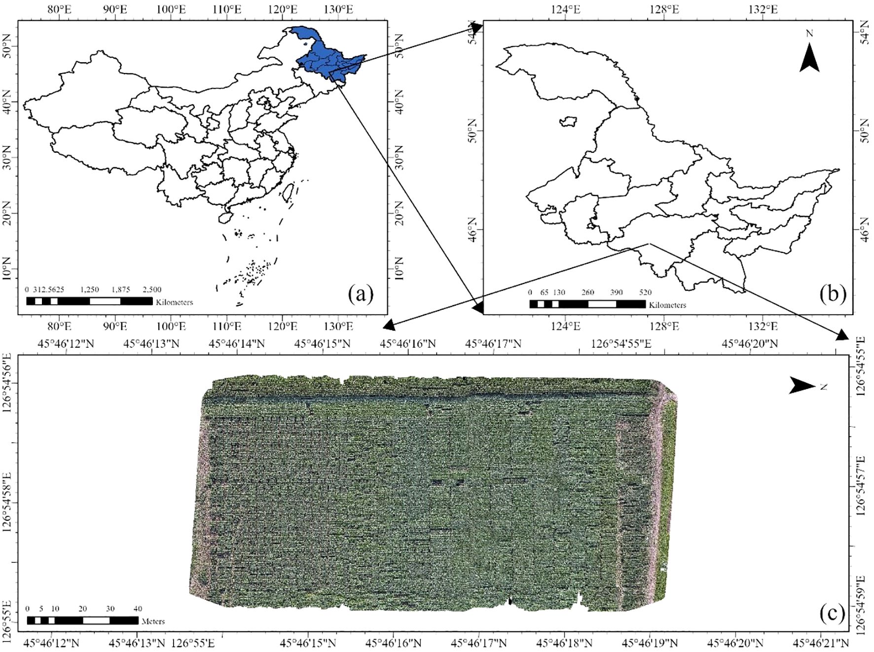 As shown in Figure 1, the study was conducted in 2024 at the Xiangyang Farm, located in Harbin City, Heilongjiang Province, China, within the Northeast Plain—one of the world’s three largest black soil regions. This area is renowned for its fertile soil, which is particularly well-suited for soybean cultivation. Heilongjiang Province, where the site is located, is responsible for producing over 50% of China’s soybean output (National Bureau of Statistics of China, 2022). The geographic coordinates of the site are 45°45’N latitude and 126°54’E longitude, with an average elevation of approximately 150 m. The region experiences a temperate monsoon climate, characterized by an average annual precipitation of 552.9 mm and an average annual temperature of 3.8°C. The majority of the rainfall, over 70%, occurs between May and August (Wikipedia contributors, 2025). In May 2024, 100 soybean varieties, selected for their suitability in Northeast China and varying in yield and growth periods, were planted. These varieties were also used for model validation to assess the robustness of the estimation results across different genotypes. The names of all varieties are listed in Appendix Table A2.The management of pesticides and fertilizers adhered to local practices.
