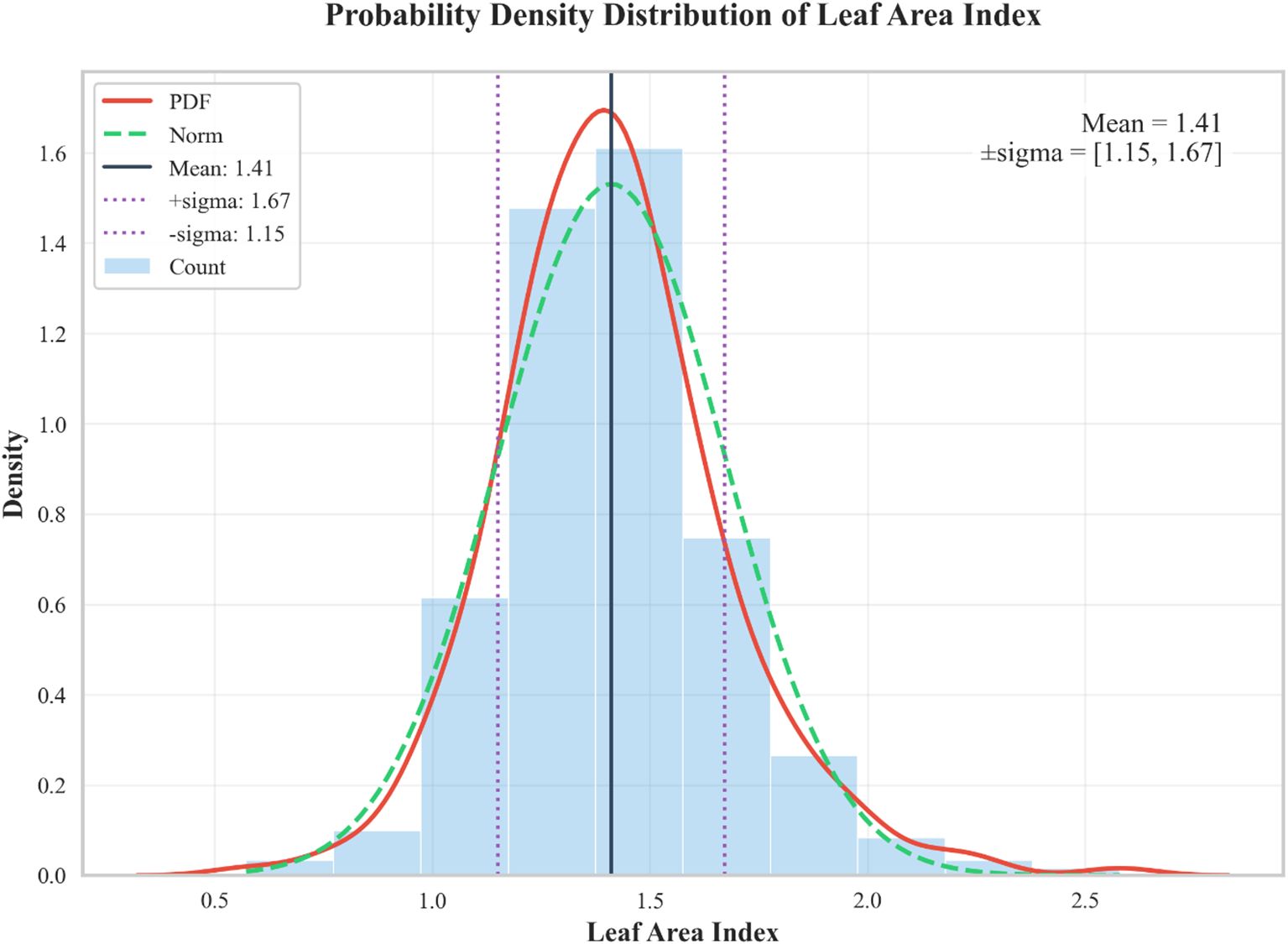 Figure 3. Histogram of LAI. The green dashed line represents a normal distribution fit, the red curve indicates the probability density function (PDF) fit, the purple dashed line shows data within one standard deviation, and the black solid line represents the mean value.