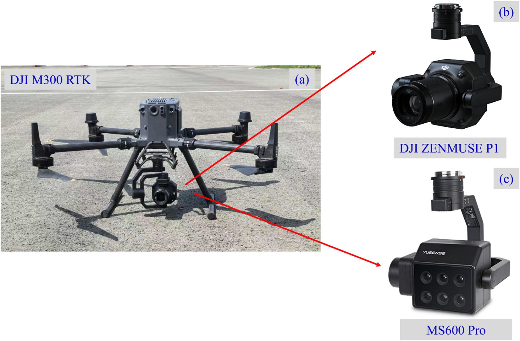 Figure 4. UAV-based crop phenotyping observation platform. (a) DJI M300 RTK UAV; (b) Zenmuse P1 RGB camera; (c) MS600 Pro MS camera.