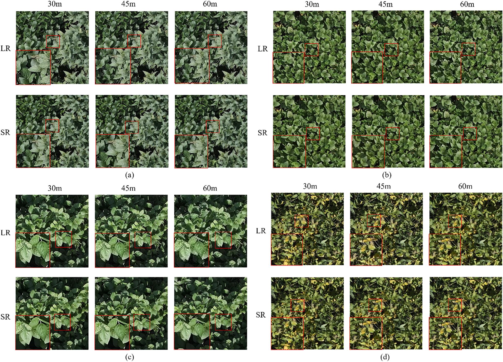 The flight efficiency of UAVs varies with flying altitude. In summary, the time required for large-scale data collection presents significant challenges to precision agriculture. To reduce collection costs, an increase in flying altitude is necessary; however, this compromises image quality and decreases image resolution. Previous studies have typically adjusted flight altitudes to balance the relationship between flight duration and data accuracy (Jay et al., 2019). However, high-resolution sensors are often costly and limited in coverage, while low-altitude flights are time-consuming and less practical for large-scale monitoring. Therefore, a cost-effective solution is needed to enhance image resolution without additional flight or hardware costs. To address the issue of low resolution in high-altitude imagery, employing Image Super-Resolution (SR) algorithms is considered an appropriate method (Jonak et al., 2024). Image SR involves reconstructing low-resolution images (LR) into high-resolution images (HR) using computer vision algorithms. In remote sensing, SR technology enhances image detail, resolution, and quality through AI models, proving to be of extensive and practical value in fields such as land cover classification, crop monitoring, and object detection. In particular, SR not only improves visual quality but also enhances the extraction of fine textural and structural features from UAV imagery, thereby potentially improving model robustness and predictive accuracy for biophysical variables such as LAI. Nevertheless, few studies have combined UAV-based SR imagery with multispectral data for quantitative crop trait estimation such as LAI, especially for soybean canopies.