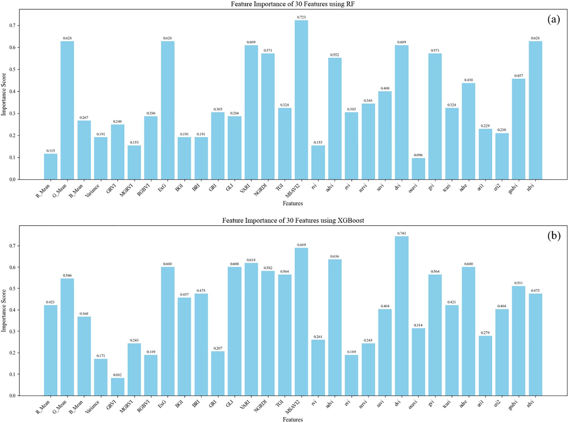 Figure 6. Feature importance of 30 selected features evaluated using two tree-based ensemble methods: (a) Random Forest (RF) and (b) XGBoost. The importance scores shown reflect the relative contribution of each feature to the model’s predictive performance. Differences between RF and XGBoost reflect variations in how each method assesses feature relevance.