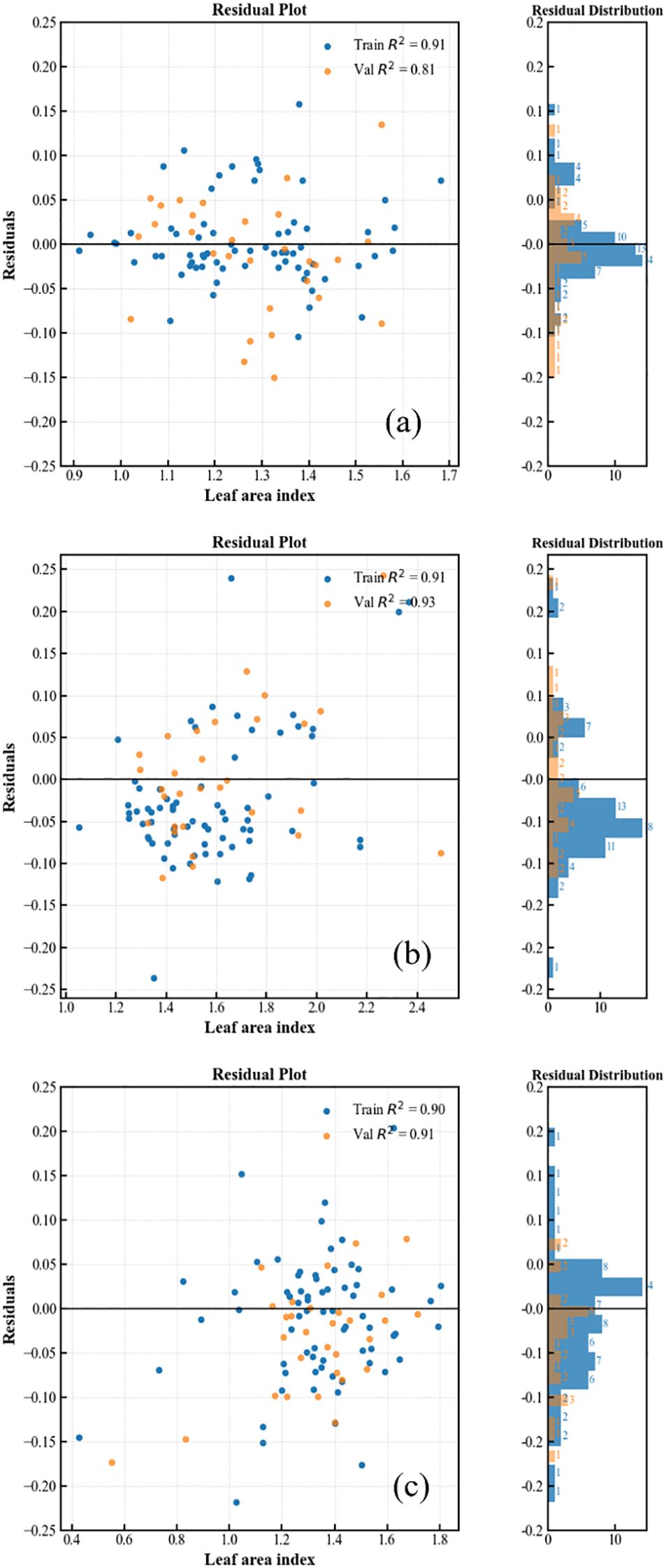 In this section, the performance of the XGBoost model combined with multisource information fusion (RGB+MS) was evaluated across different periods for leaf area estimation. Figure 7 displays the final evaluation results. In each panel, the scatter plot on the left plots the estimated leaf area (x-axis) against the residuals, which are the differences between the estimated and true leaf areas (y-axis). On the right, a histogram illustrates the distribution of these residuals. The analysis indicates that the model adapts well to leaf area estimation, with absolute residuals less than 0.25, and the residuals across three dates approximating a normal distribution.