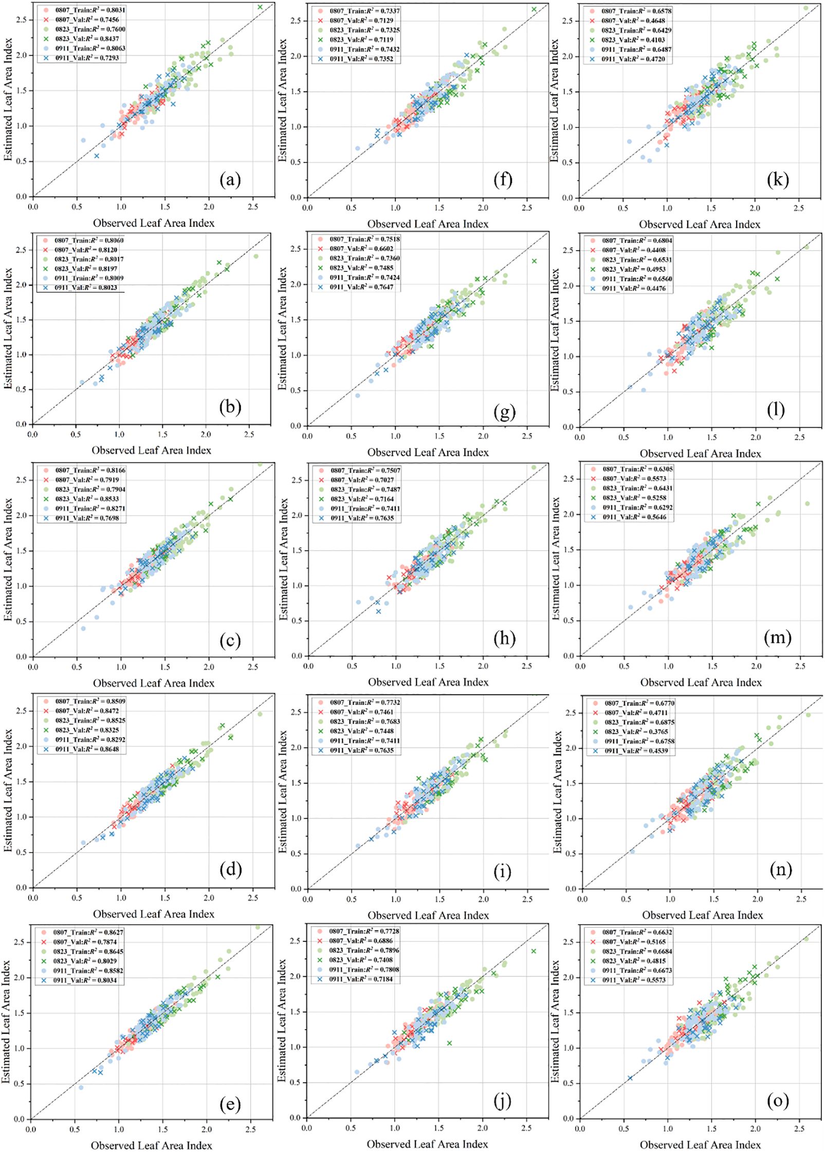 Figure 8. Relationship between the estimated and measured LAI across three different altitudes and four SR methods within both training and validation datasets. At 30-meter altitude: (a) without SR, (b) using SRCNN, (c) using EDSR, (d) using Real-ESRGAN, (e) using SwinIR. At 45-meter altitude: (f) without SR, (g) using SRCNN, (h) using EDSR, (i) using Real-ESRGAN, (j) using SwinIR. At 60-meter altitude: (k) without SR, (l) using SRCNN, (m) using EDSR, (n) using Real-ESRGAN, (o) using SwinIR. The color coding indicates the dates of LAI estimation: red for August 7, green for August 23, and blue for September 11. The data points in the figures are differentiated into training and validation datasets, as indicated by distinct shapes.