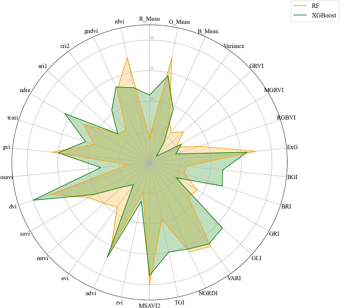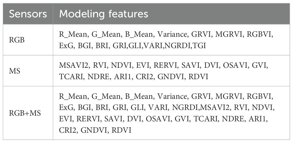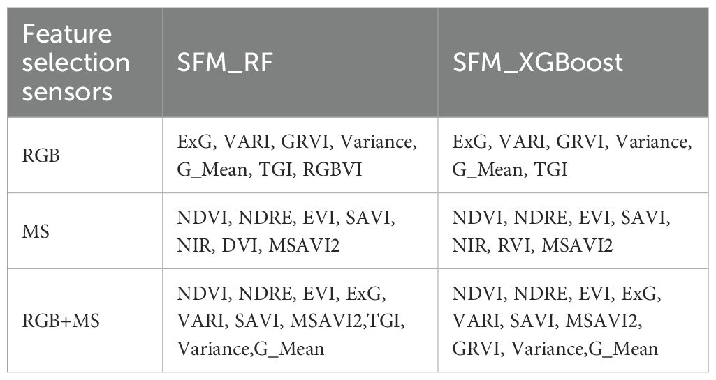 A feature dataset comprising all input features was constructed based on each cropped plot image. To mitigate the impact of inter-feature correlation, feature selection was performed using the SelectFromModel (SFM) method described in Section 2.8.In this study, two machine learning methods were utilized; therefore, RF and XGBoost models were employed for feature selection. Table displays the subsets of features selected by the SFM method from three types of input datasets, all chosen from images at a 15-meter altitude without SR.