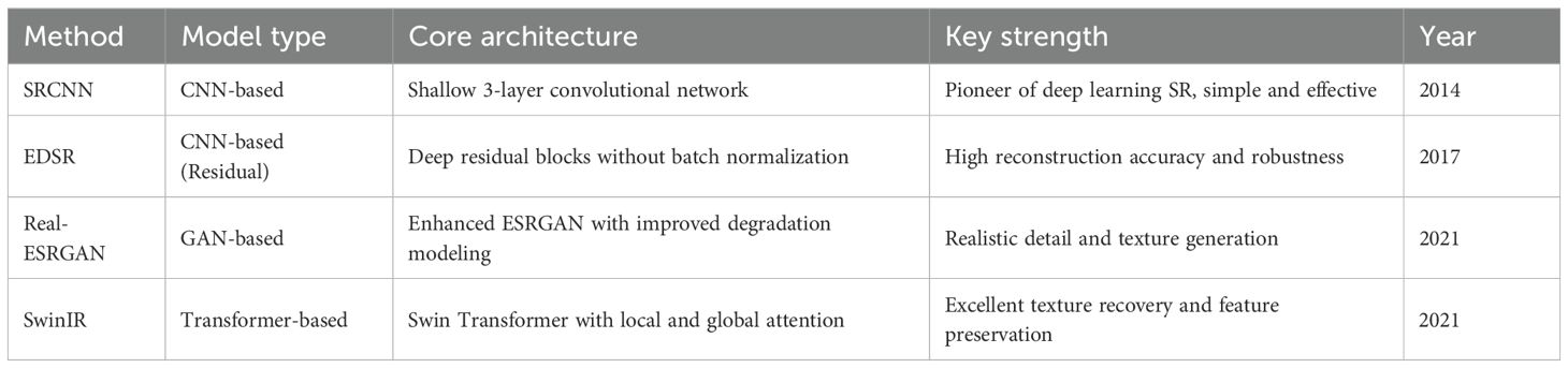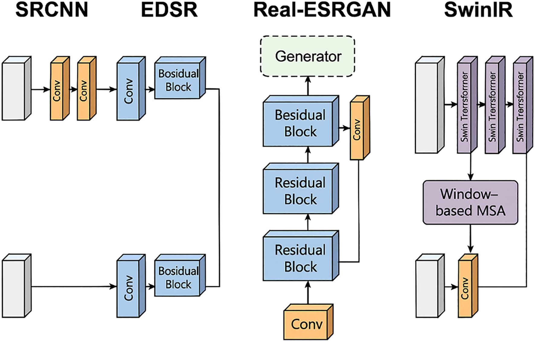 Real-ESRGAN, introduced in 2021, builds upon EDSR by incorporating a more complex GAN structure and enhancing the training data degradation model to support more realistic low-quality inputs (Wang et al., 2021). SwinIR, also from 2021, is based on the Swin Transformer, a sliding window transformer that naturally excels at modeling long-distance dependencies and understanding distant texture correlations in images, which is particularly crucial in crop imaging (e.g., the directionality of leaf veins and textures) (Liang et al., 2021). Figure 10 illustrates the structural differences among the four network architectures. SRCNN and EDSR rely solely on local convolution to interpret images, whereas Real-ESRGAN introduces a GAN structure that establishes an adversarial process between the generator and the discriminator. This process not only seeks numerical closeness but also aims to visually deceive the discriminator, thereby generating more natural images with high-frequency details (Zhang et al., 2023). SwinIR employs localized window attention and a sliding window mechanism, allowing for regional modeling while also capturing information from distant areas. Overall, Real-ESRGAN exhibits significant advantages in realistic degradation modeling and detail enhancement, while SwinIR achieves breakthroughs in feature modeling capability and distant texture reconstruction. Both methods surpass traditional CNN approaches in terms of visual perception quality and practical application results. These findings are consistent with the conclusions of this study, which indicate that models optimized with Real-ESRGAN and SwinIR exhibit higher precision than those using traditional CNN techniques. The differences in the network architectures of the four methods are shown in Figure 10.