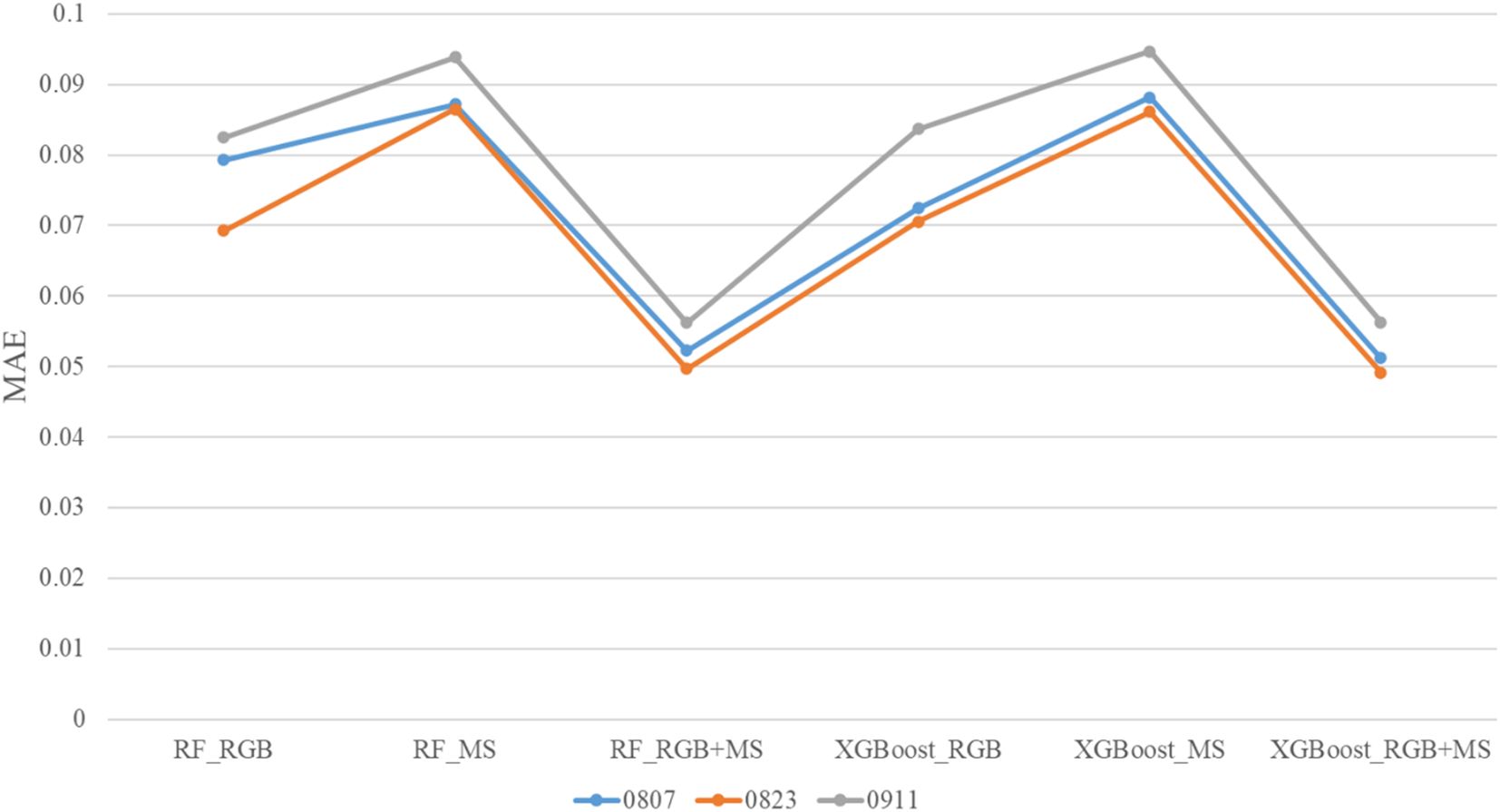 To examine the influence of soybean LAI on the accuracy of estimation models, Figure 11 illustrates the distribution of MAE for LAI estimates over three distinct time periods. Statistical analysis of the results revealed that the estimation model more accurately reflected LAI during August. However, estimation precision noticeably decreased during the late growth stage in September. One plausible explanation for this decline is the reduced sensitivity of vegetation indices, such as NDVI and EVI, to LAI. As the growth season progresses, leaf senescence and thinning occur, leading to a situation in which, despite a reduction in LAI, changes in NDVI and EVI become minimal, resulting in inaccurate model estimations. Leaf discoloration and the concomitant decrease in chlorophyll content cause vegetation indices to reflect not only leaf area but also information indicative of physiological aging. With reduced vegetation cover, more of the ground surface—including bare soil and dry grass—is exposed, mixing soil signals with those received by the sensors. Consequently, while vegetation indices may show a decline, substantial leaf area may still remain, causing the model to erroneously interpret a greater decrease in LAI. Moreover, spectral information primarily originating from leaves reduces the MAE of MS data used in LAI estimation.
