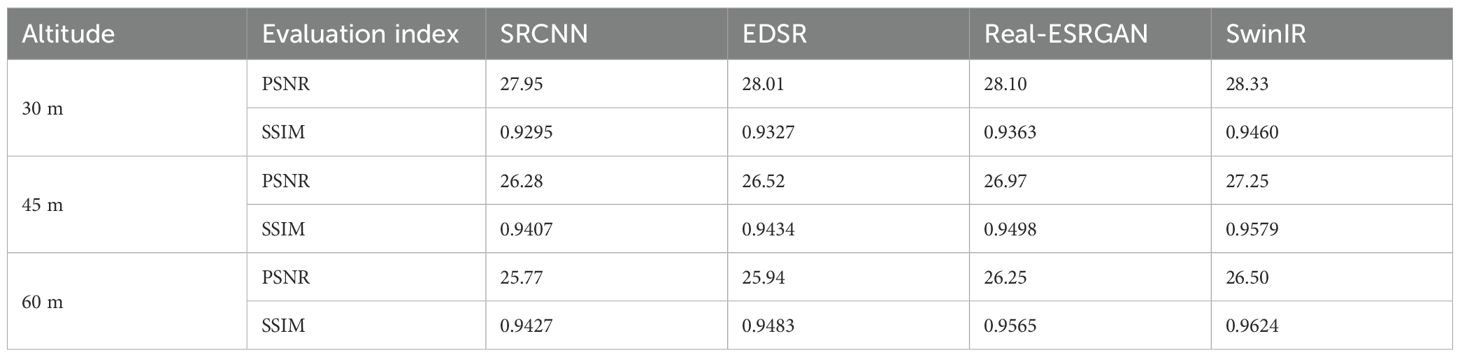 This study employs the PSNR and SSIM indices to evaluate the SR effect. Despite their widespread use in image quality assessment, PSNR and SSIM exhibit numerous limitations in the agricultural sector. They struggle to reflect the semantic fidelity of key agricultural features within images, respond sensitively to changes in critical areas, and are highly sensitive to environmental variations (Hore and Ziou, 2010; Nigam and Jain, 2020). Therefore, in agricultural image processing, a comprehensive evaluation should incorporate perceptual indices or task-related metrics. This study evaluates the effect of SR based on the accuracy of the final LAI evaluation.