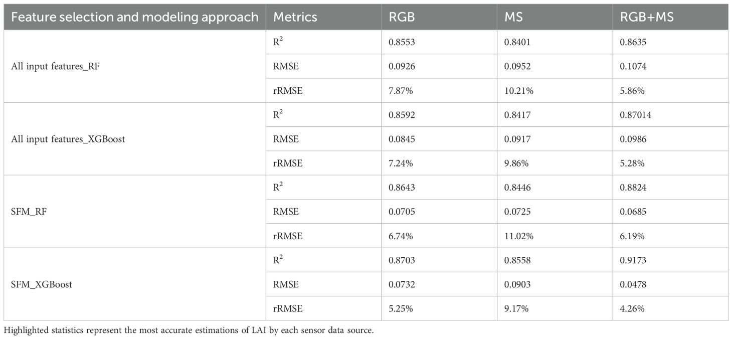 Therefore, incorporating spectral information from multiple sensors provides a more comprehensive representation of canopy characteristics. In this study, the multi-source data fusion approach (RGB + MS) enabled the joint use of spectral and structural features, effectively improving LAI estimation accuracy. This emphasizes the importance of combining spectral indices with textural and canopy-structural features in the inversion process, demonstrating the advantage of multi-source fusion for capturing LAI-related variability (Delegido et al., 2011).