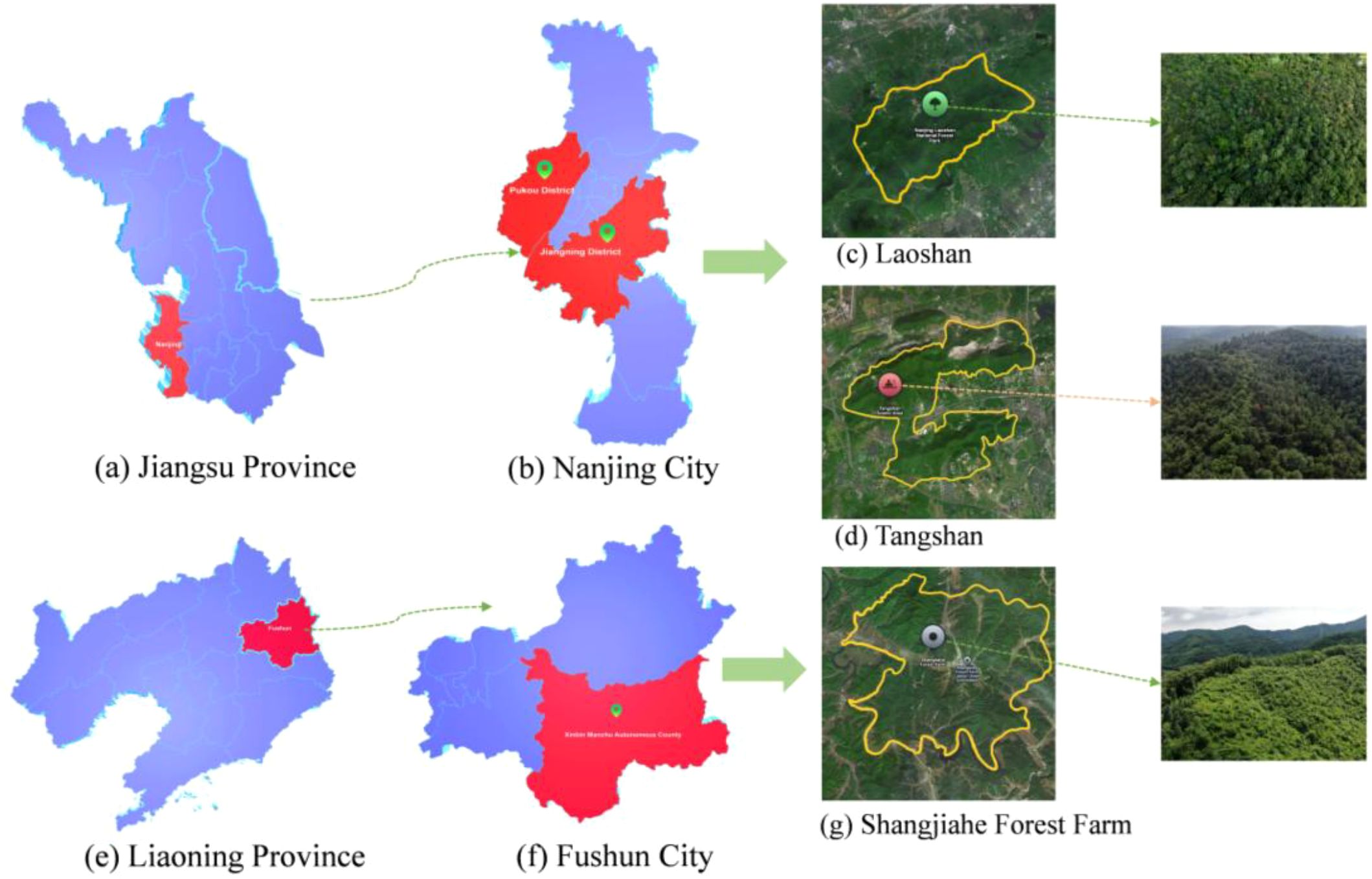 Figure 1. Study area of this paper. (a) Jiangsu Province. (b) Nanjing City. (c) Laoshan. (d) Tangshan. (e) Liaoning Province. (f) Fushun City. (g) Shangjiahe Forest Farm.