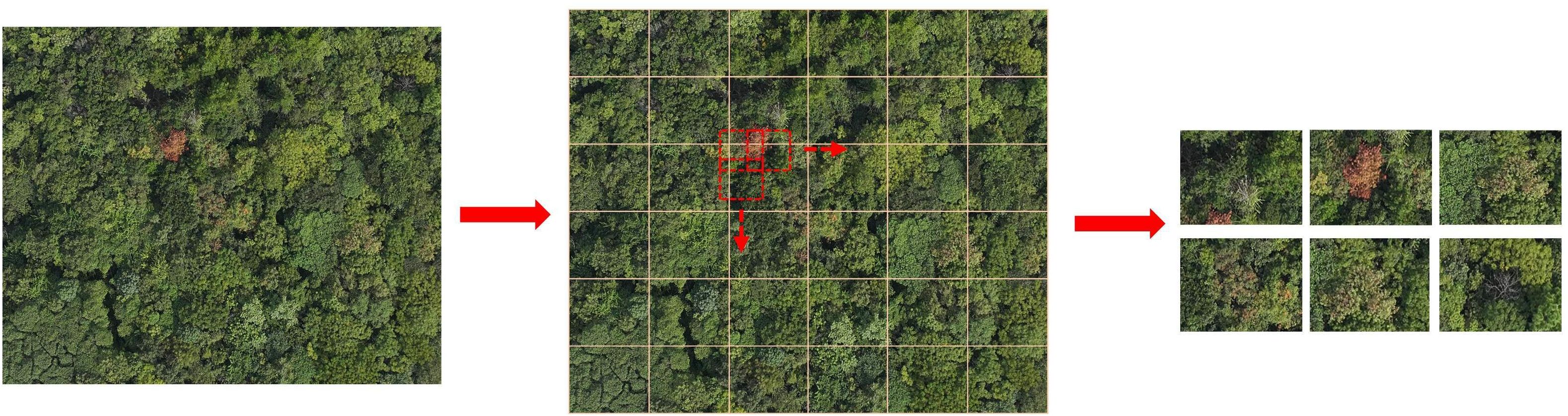 To enhance the detection accuracy of PWD of small targets and enhance the diversity of sample data sets, a slicing method based on sliding window is introduced in this paper. By dividing the original large image into several local regions, this method reduces the attention range of the model and helps to enhance the saliency of small targets in the background. Figure 4 shows the sliding window slicing process. In this study, the original image is divided into 36 sub-regions evenly, and the overlap rate between regions is set to 10% to reduce the probability of truncation when the target is located in the edge region.