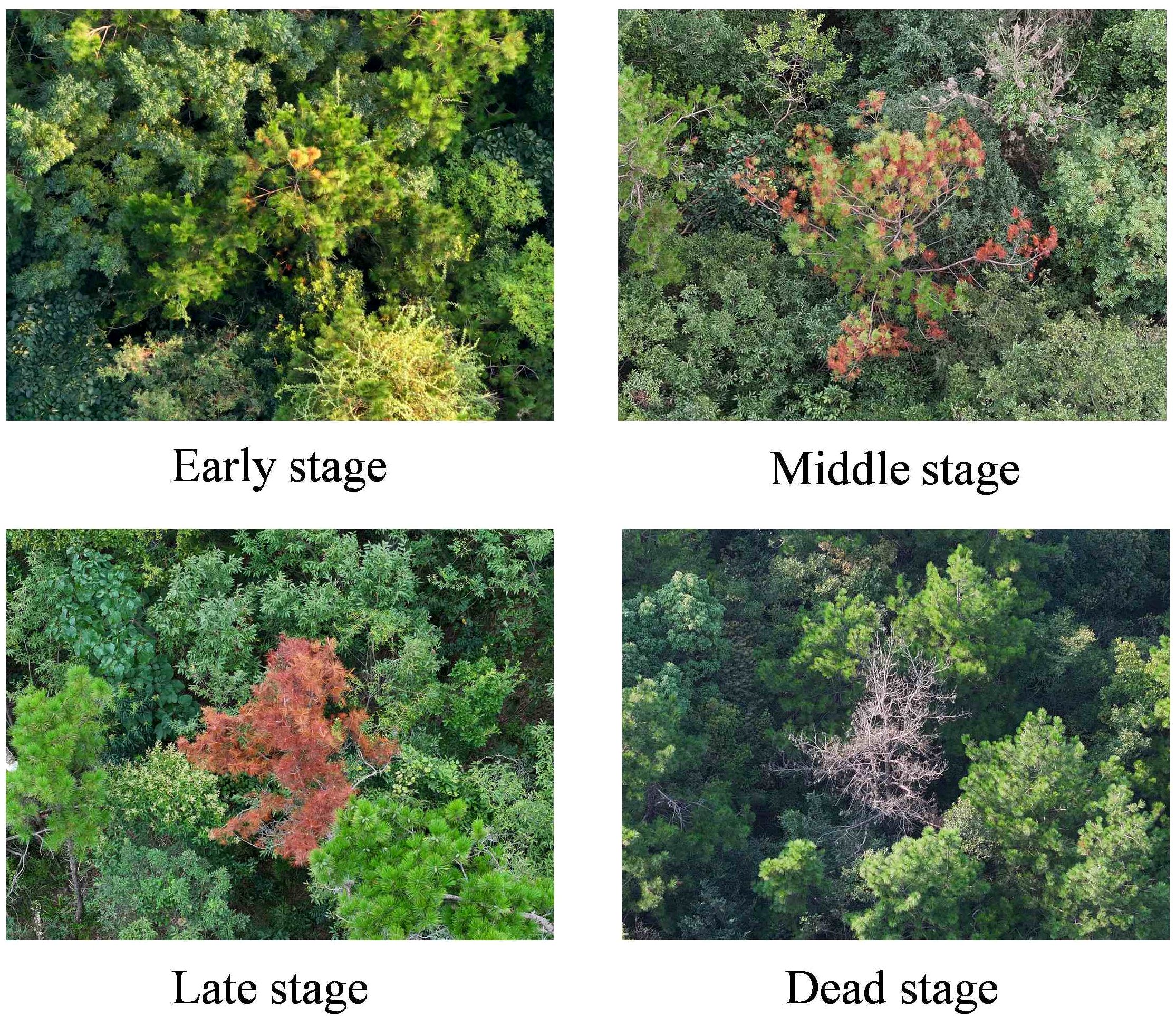 Based on the clinical manifestations and visual characteristics of PWD, the infection process was categorized into four distinct stages, which are early, middle, late, and dead tree, as illustrated in Figure 5. In the early stage, needles typically exhibit star-shaped yellowing, initially occurring at the crown apex or in localized clusters and gradually spreading outward. In the middle stage, needles wither extensively, with infected areas turning yellow or grayish yellow. In the late stage, needles display widespread yellowing and wilting, accompanied by a decline in tree vitality; trunks lose their green hue and turn dark brown. In the dead tree stage, needles and branches are almost entirely shed, with evident signs of decay; trunks appear gray or dark brown.