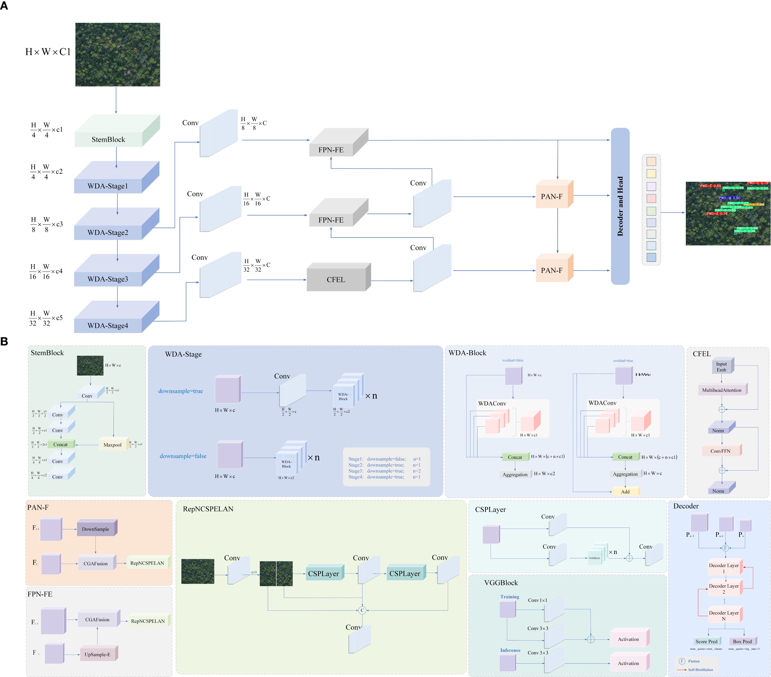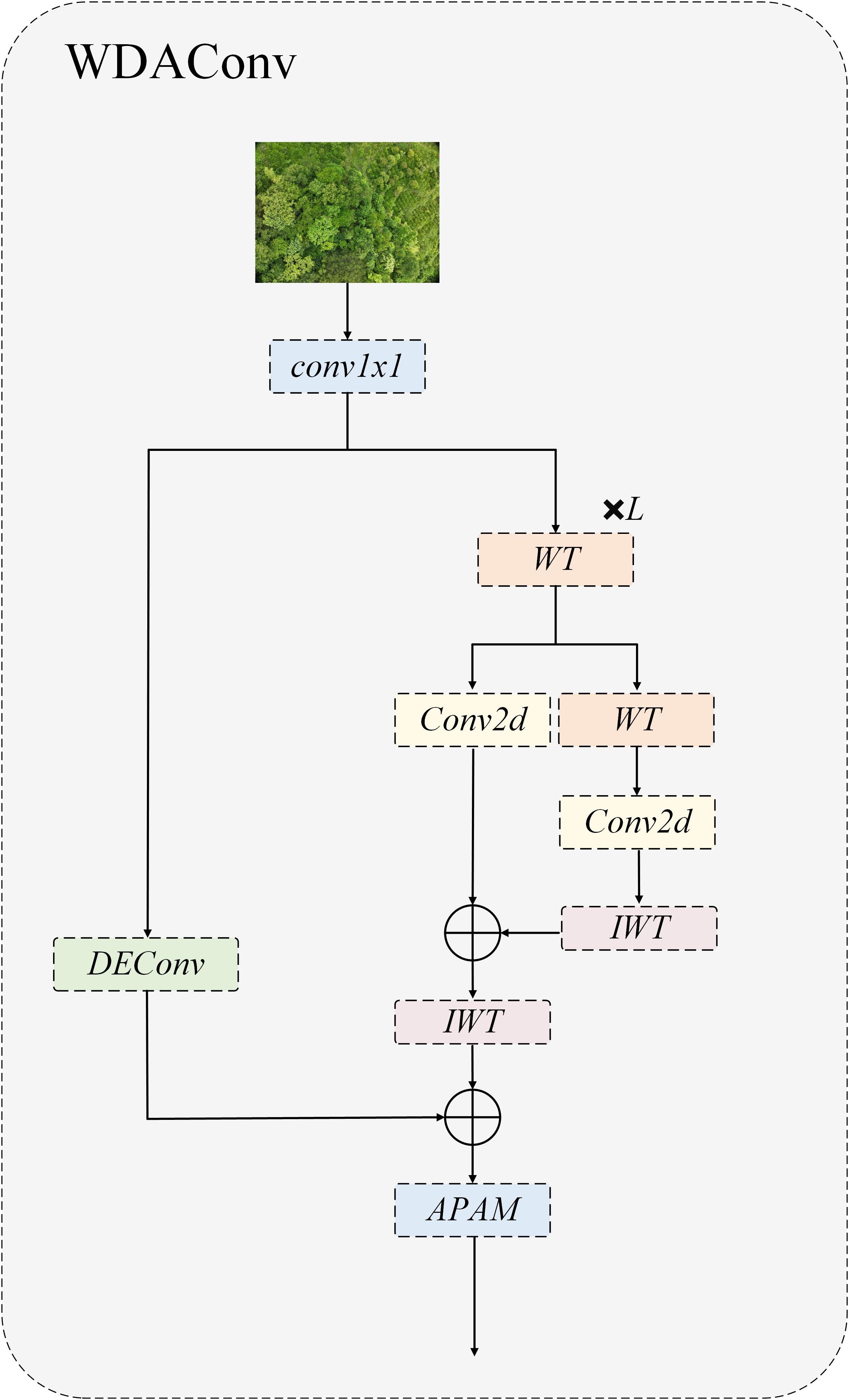 The detection of early PWD presented a complex difficulty of small scale, weak contrast, dense and easy occlusion. The disease spots were mostly fine chlorosis and fine texture anomaly of needle level, which were essentially high frequency components and were often submerged by complex woodland background. If high frequency details are suppressed or lost in the early stage of feature extraction, the separability and detection stability of small targets will decrease significantly. In order to meet the above challenges, this research innovatively proposes Wavelet Detail Attention Convolution (WDAConv), which is a multipath convolution module around frequency decomposition, structure coding and saliency fusion, and its overall architecture are illustrated in Figure 7. The module uses 2D Haar wavelet to decompose and reconstruct multi-scale frequency (Finder et al., 2024), DEConv to encode multi-directional edge and texture, and APAM to implement joint reweighting in channel and spatial dimensions to complete cross-branch semantic consistent aggregation.