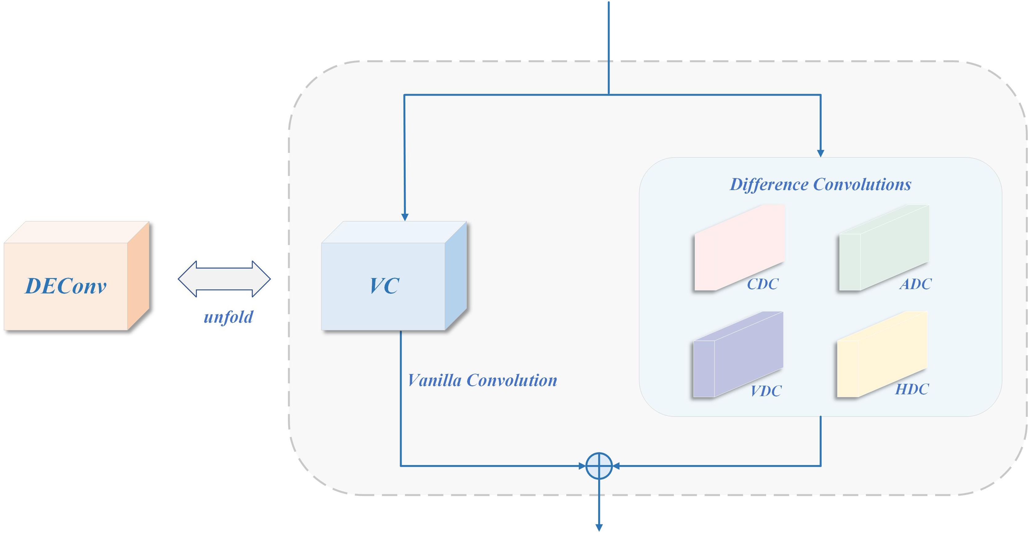 DEConv (Chen et al., 2024) is introduced as a compensation path for high-frequency details, aimed at strengthening the accurate characterization of fine-grained textures and edge structures. This module adopts multi-branch structure, which fuses standard convolution and differential convolution in multiple directions (such as vertical, horizontal, and diagonal) and can effectively capture weak texture anomalies and structural mutations in the lesion area. Its structure is shown in Figure 8. The fused features are subjected to channel aggregation through 1x1 convolution to output an enhanced feature map (Wang et al., 2024a; Chen and Wang, 2025; Zhao et al., 2025).
