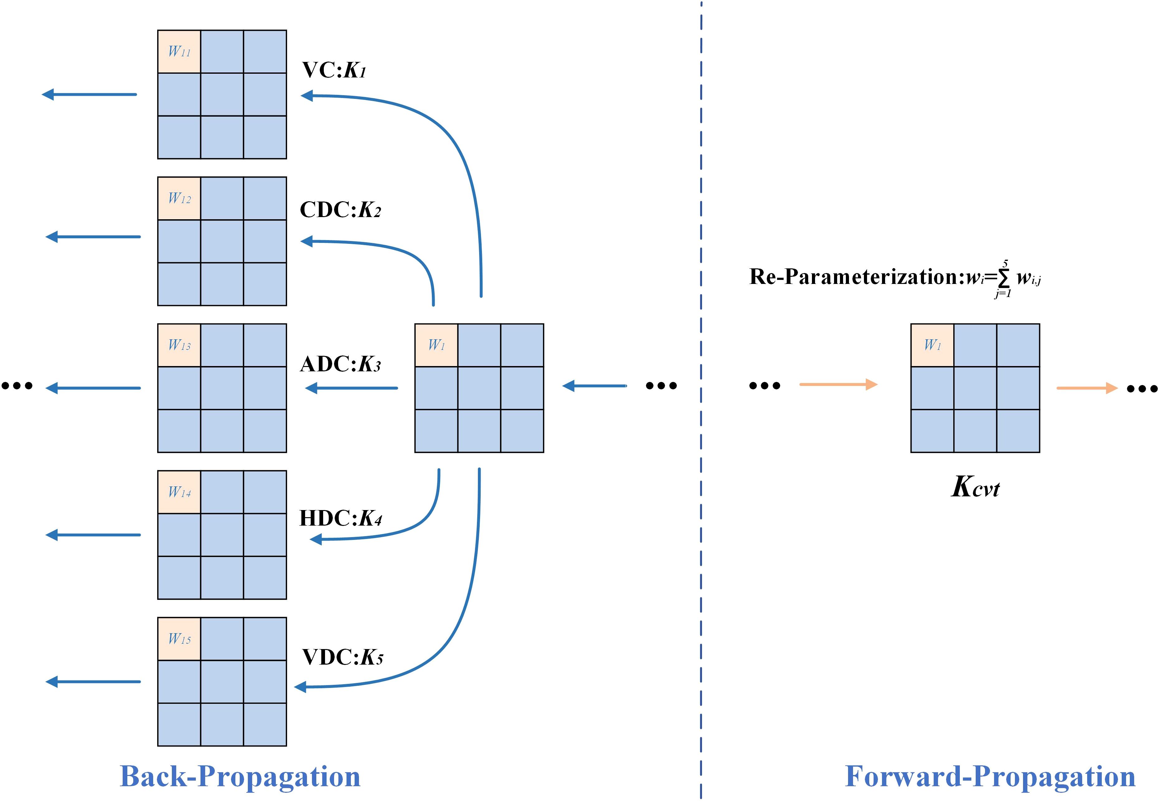 Where represents convolution kernels in different directions (including VC, HDC, VDC, CDC, ADC), represents convolution operation, and is the equivalent convolution kernel after conversion.