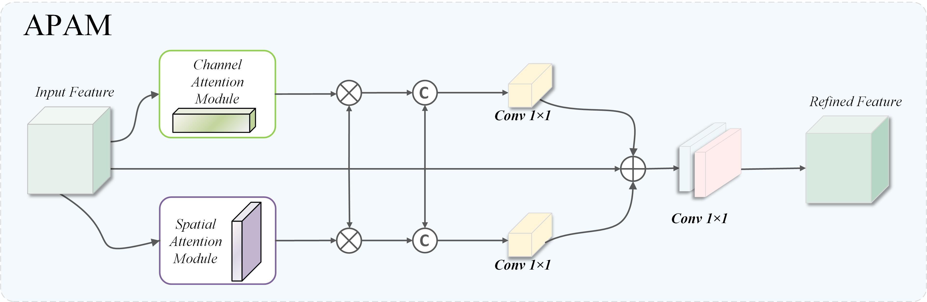 The proposed APAM can model collaboratively in three dimensions: channel, space, and original features, and strengthen the ability of capturing significant features of disease regions while maintaining original semantic information. It can significantly improve the perception accuracy and regional positioning ability of weak disease spots in early PWD detection, especially suitable for complex scenes with small lesion area, fuzzy boundary or covered by background interference.