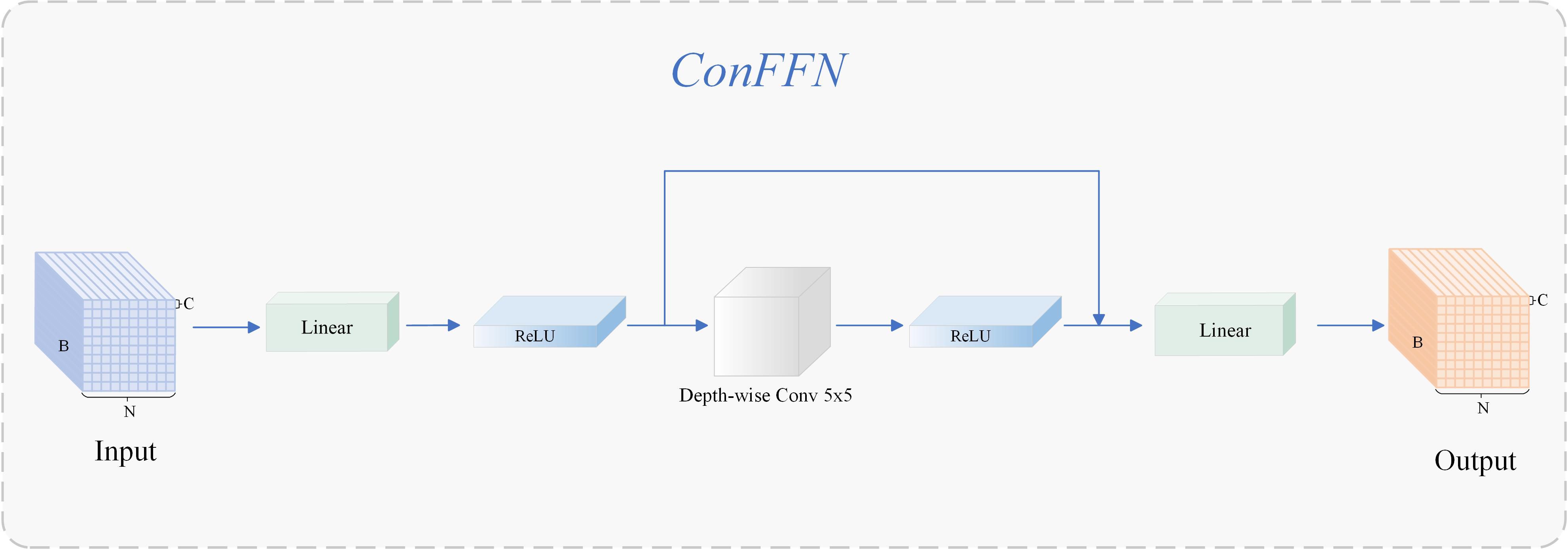 Although Vision Transformer exhibits strong modeling capabilities for visual tasks, its inherent low-pass filtering properties make it less responsive to local high-frequency structures, especially for detecting high-frequency pathological features such as early PWN lesions that present weak chlorosis and fine texture. For this structural shortcoming, this paper introduces ConvFFN (Zhou et al., 2023a, b) to improve the modeling ability of encoder for fine-grained texture. ConvFFN structure is shown in Figure 11. This module was first proposed by Zhou et al. (2023a) in SRFormer and subsequently developed into a lightweight high-frequency modeling scheme in CATANet (Liu et al., 2025a). ConvFFN achieves spatial dimension information enhancement while maintaining FFN interface consistency by embedding 5×5 convolution branches with depth separation between two linear transforms, effectively alleviating self-attention suppression of high-frequency components (Chenghai et al., 2025).