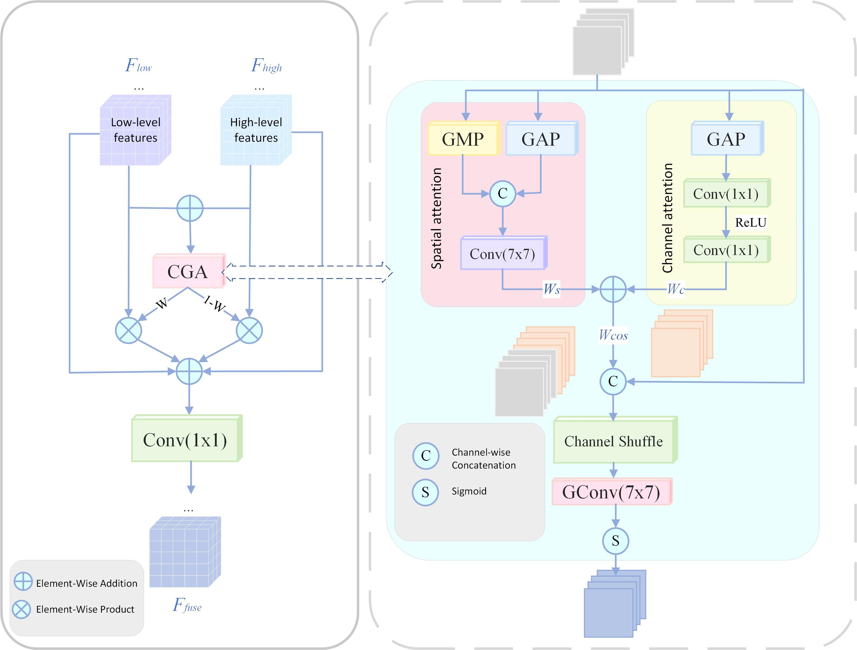 Finally, in order to obtain the refined global feature map , the CGAFusion adjusts each channel of under the guidance of the input features to generate the final . The operation process is described in Equation 12: