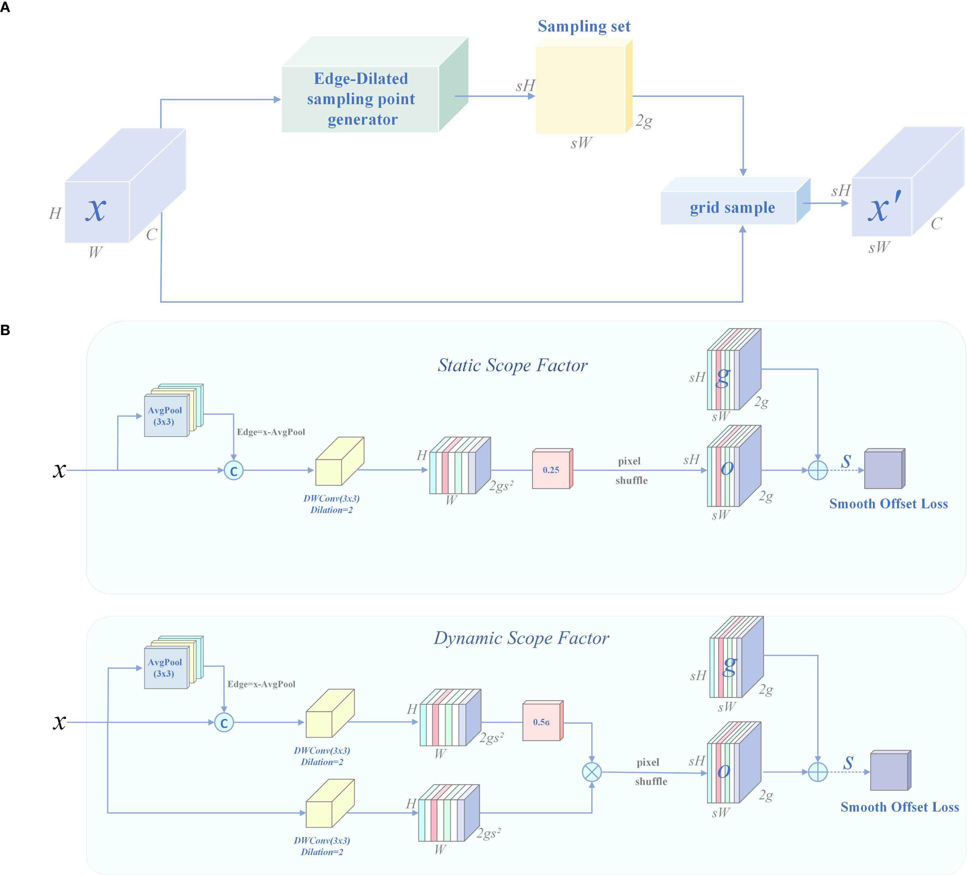 Figure 13. Structure of DySample-E. (A) Sampling based dynamic upsampling. (B) Edge-Dilated sampling-point generator (DySample-E).