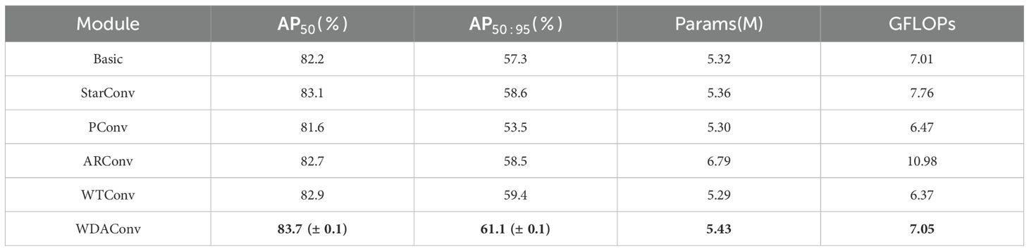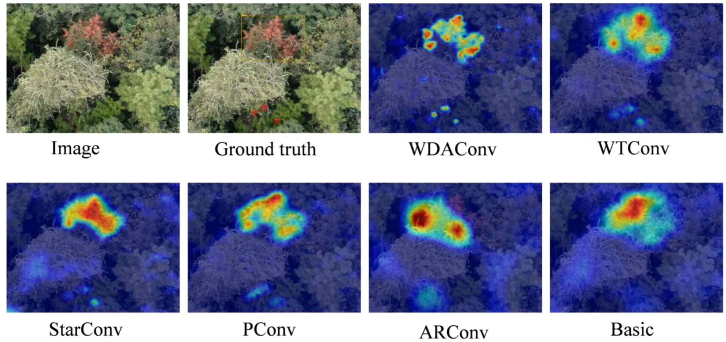 While maintaining a lightweight design, WDAConv is able to preserve weak-contrast details and needle-leaf directional textures that are easily lost by conventional spatial convolutions, standalone attention mechanisms, or pure wavelet convolutions. These existing methods often struggle to maintain both high-frequency fidelity and semantic consistency in weak-texture and low-contrast small-target scenarios. By alleviating early-stage feature degradation, WDAConv provides more reliable fine-grained cues for the stable recognition of early-stage PWD lesions. In essence, WDAConv offers a frequency-aware lightweight convolutional modeling approach tailored for weak-texture small-target detection, an ability that traditional spatial-domain convolutional structures inherently lack.