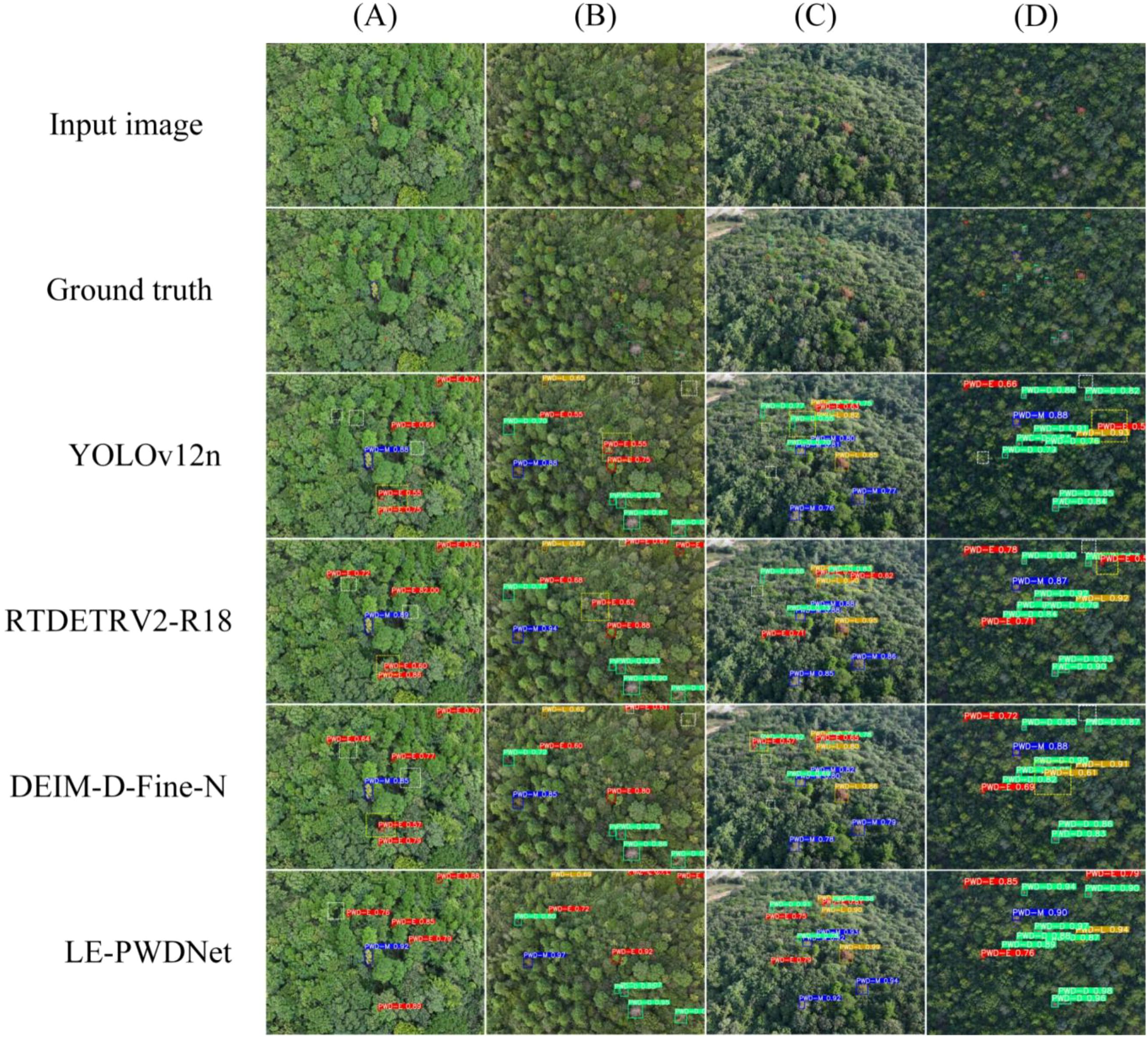To intuitively demonstrate the performance differences among detection models in the PWD identification task, four representative images were selected from the constructed PWD dataset. These images correspond to typical infection stages, complex background scenarios, and diverse imaging conditions. A systematic visual comparison was conducted on four representative models: LE-PWDNet (Ours), DEIM-D-Fine-N, RT-DETRv2-R18, and YOLOv12n, as illustrated in Figure 15. The selected samples comprehensively cover the four key pathological stages of PWD (PWD-E, PWD-M, PWD-L, PWD-D), while also considering challenging environmental factors such as dense forest regions, mountainous terrain, interference from broadleaf trees, and canopy occlusion. This setup ensures a broad and targeted validation of model robustness and generalization ability.