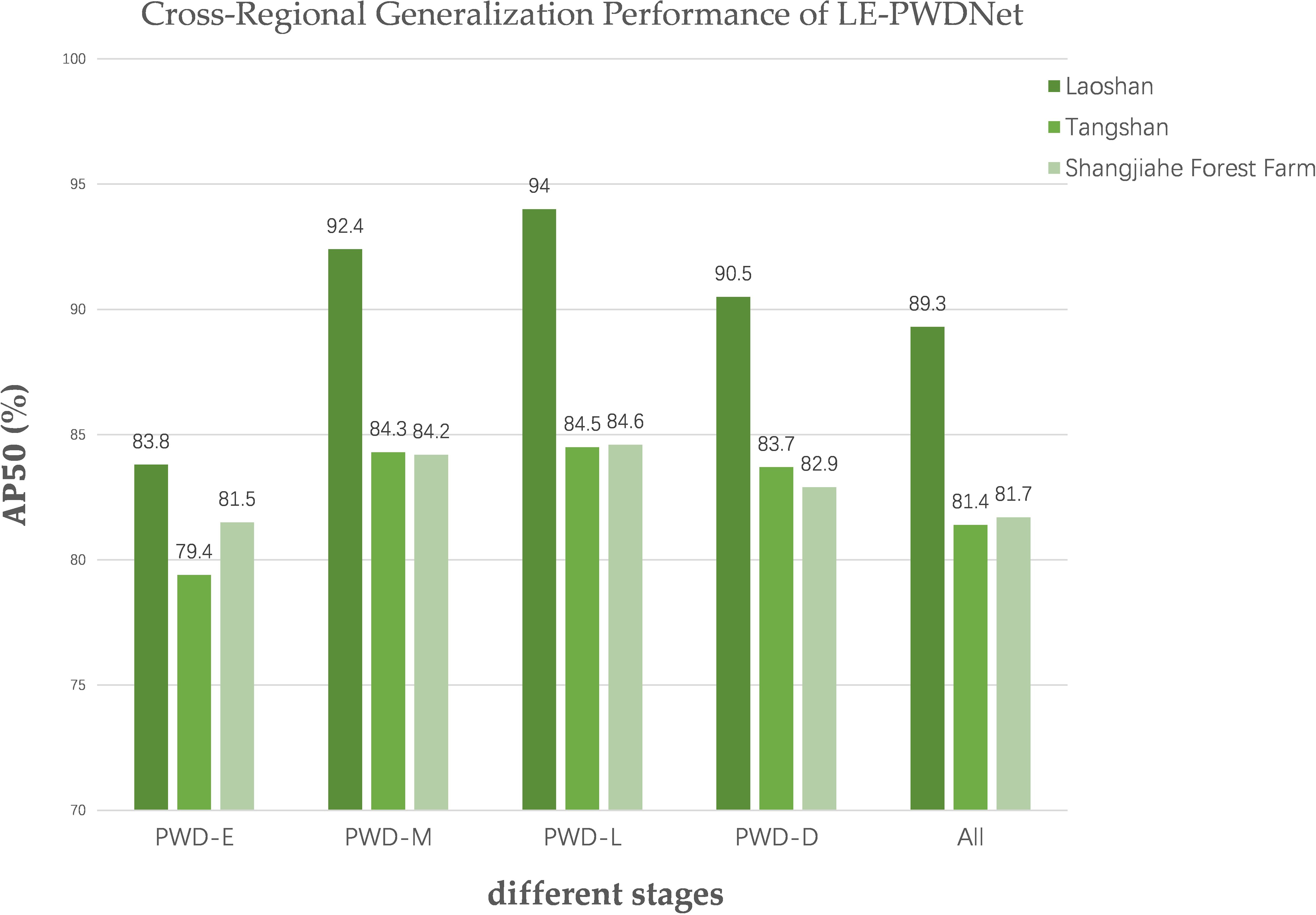Although in-domain evaluation on the Laoshan dataset can reflect the model’s performance in its native ecological environment, it remains insufficient to fully verify its adaptability under diverse ecological conditions. To address this limitation, under strict zero-shot conditions, the LE-PWDNet model that was trained solely on the Laoshan dataset comprising 36,845 images across four infection stages was directly applied to two independent datasets from the Tangshan Scenic Area in Jiangning District, Nanjing, and the Shangjiahe Forest Area in Fushun City. The two datasets comprise 2,560 and 3920 high-resolution raw images and differ markedly from Laoshan in terrain, forest structure, dominant tree species, and lighting conditions, thereby providing more challenging test environments for cross-regional generalization assessment. The evaluation employed the same metrics as the in-domain experiments, and performance comparison plots were generated to quantify accuracy variations across different infection stages and to analyze feature transfer behavior (Figure 16). The results indicate that LE-PWDNet maintained high detection accuracy for early-stage infection under zero-shot transfer to Tangshan and Shangjiahe, with overall cross-regional performance changes remaining moderate, thus demonstrating strong generalization stability.