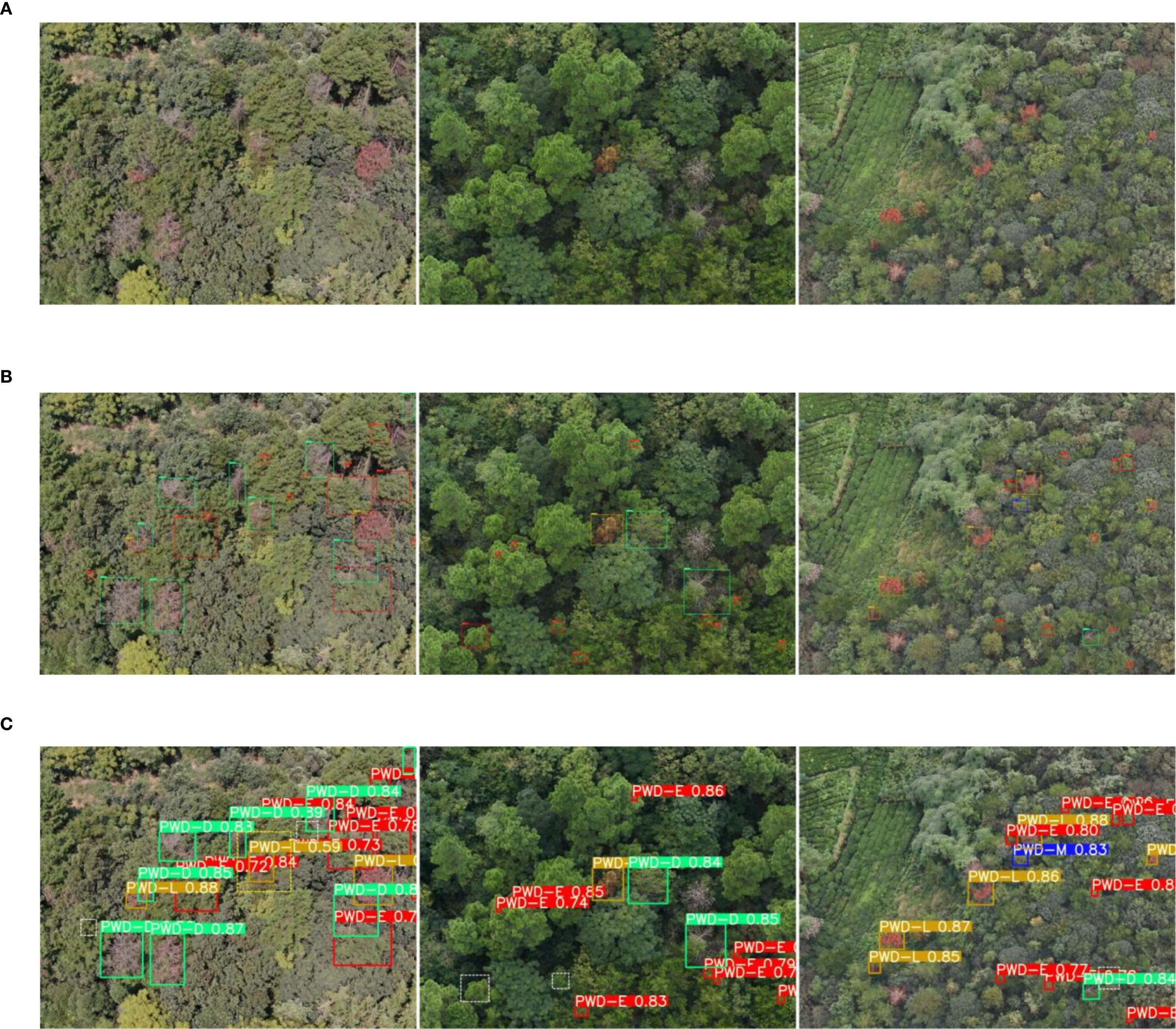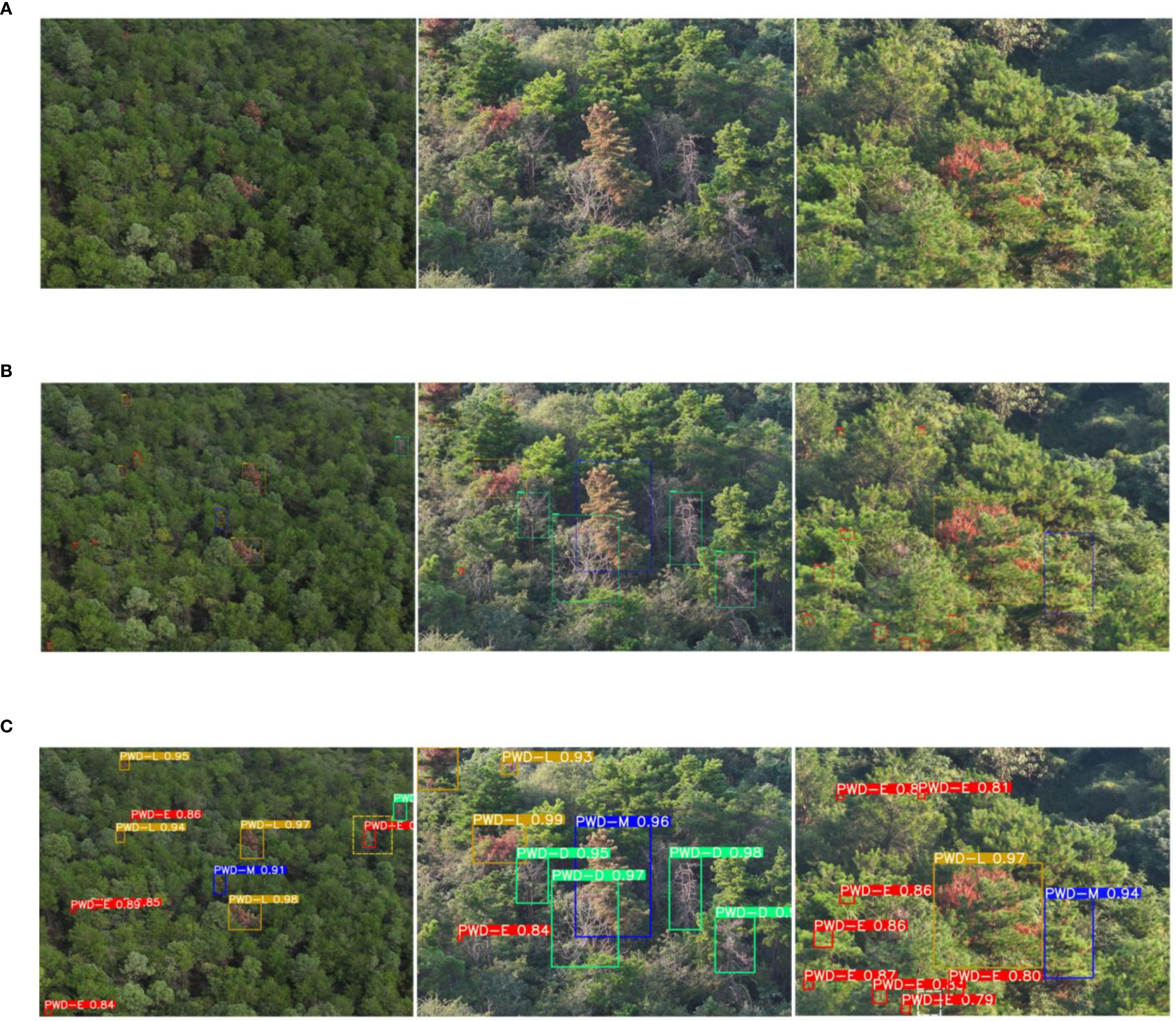 Pine Wilt Disease (PWD), also known as pine wood nematode disease, is a devastating forest disease caused by Bursaphelenchus xylophilus (Li et al., 2022). The pathogen originated in North America and has spread widely to East Asia in recent years. It spreads rapidly and has strong pathogenicity. If it is not discovered in time, it will cause death of large areas of pine trees and cause serious ecological and economic losses (Back, 2020). In the 40 years since its invasion of China, the disease has caused disastrous economic and ecological losses, with the combined economic and ecosystem service value losses estimated at approximately US $7.4 billion in 2020 (Liu et al., 2023a). Therefore, early detection and accurate location of infected pine trees are very important to control the spread of epidemic diseases, which not only helps to protect forest resources and maintain ecosystem stability, but also has important value for promoting sustainable social and economic development.