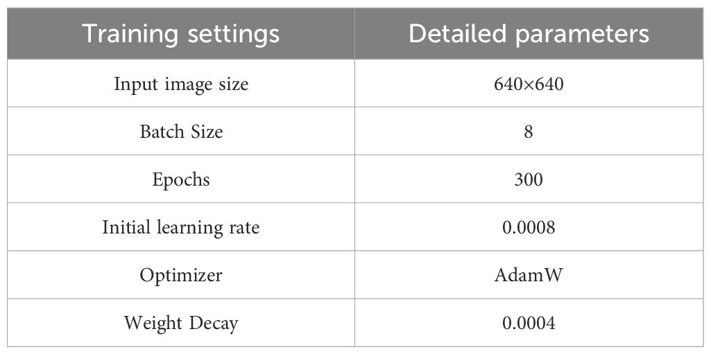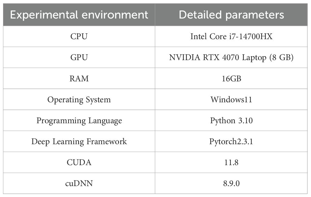 All experiments in this study were carried out within a unified hardware and software setup to guarantee the stability and reproducibility of the results, with detailed configurations provided in Table 1. Before model training, a complete set of hyperparameter schemes was pre-set, including learning rate, batch size, optimizer, and training rounds, to promote sufficient convergence and performance improvement of the model. The detailed training parameter configuration is shown in Table 2.