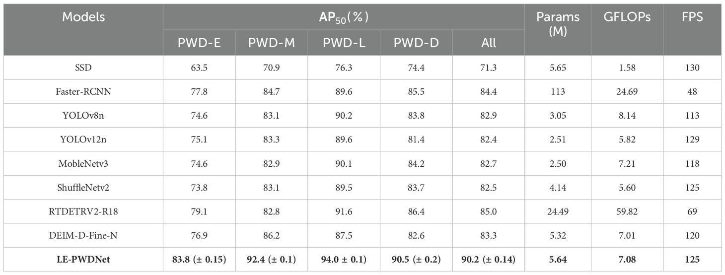 To provide a comprehensive assessment of Model LE-PWDNet, this paper selected the current mainstream object detection algorithms for comparison experiments. These include SSD (Liu et al., 2016), Faster R-CNN (Girshick, 2015), YOLOv8n (Yaseen, 2024), YOLOv12n (Tian et al., 2025), MobleNetv3 (Koonce, 2021), ShuffleNetv2 (Ma et al., 2018), RTDETRV2 and DEIM. The results of the comparative experiment are shown in Table 3. Multiple independent runs were conducted for all models to reduce the impact of randomness. To highlight the stability of the proposed model under repeated training, only the mean ± standard deviation of LE-PWDNet’s AP50 is reported in the table, while the other comparison models are presented using their averaged AP50 results.