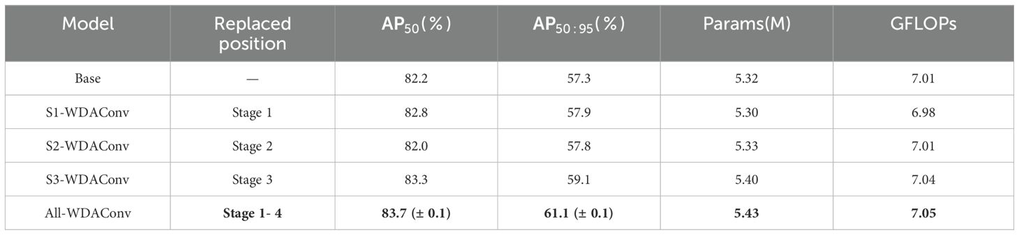 Overall, the performance evolution exhibits a “fluctuation-to-saturation” trend: shallow-layer replacement primarily reduces redundancy and enhances early-stage texture encoding, mid-layer replacement experiences mild instability due to inter-layer semantic coupling, and deep-layer replacement effectively improves multi-scale semantic contributions to high-IoU accuracy. Ultimately, the unified four-stage replacement achieves an optimal balance between detection accuracy and computational efficiency, without significantly increasing deployment cost.