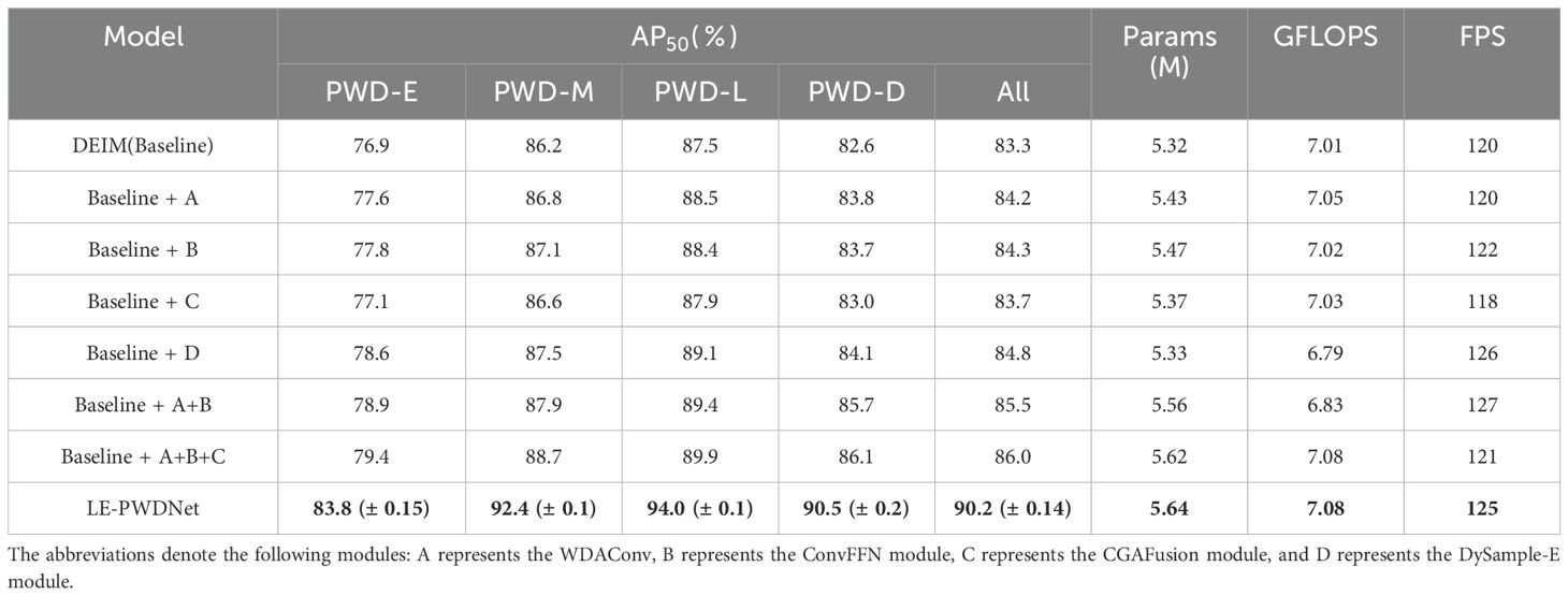 To evaluate the contribution of each key component in the proposed model to the early-stage detection of PWD, a series of ablation studies were conducted. Specifically, the experiments independently assess the impact of the following modules: WDAConv in the backbone network, ConvFFN in the hybrid encoder, CGAFusion in the feature pyramid, and DySample-E in the FPN. The baseline model used for comparison is the lightweight DEIM-D-Fine-N, which excludes all of the aforementioned components. The detailed ablation results are summarized in Table 6. Multiple independent runs were conducted for all ablation settings; to highlight the stability of the full configuration, Table 6 reports only the mean ± standard deviation of the final LE-PWDNet’s AP50, while the other variants are shown using their averaged results.