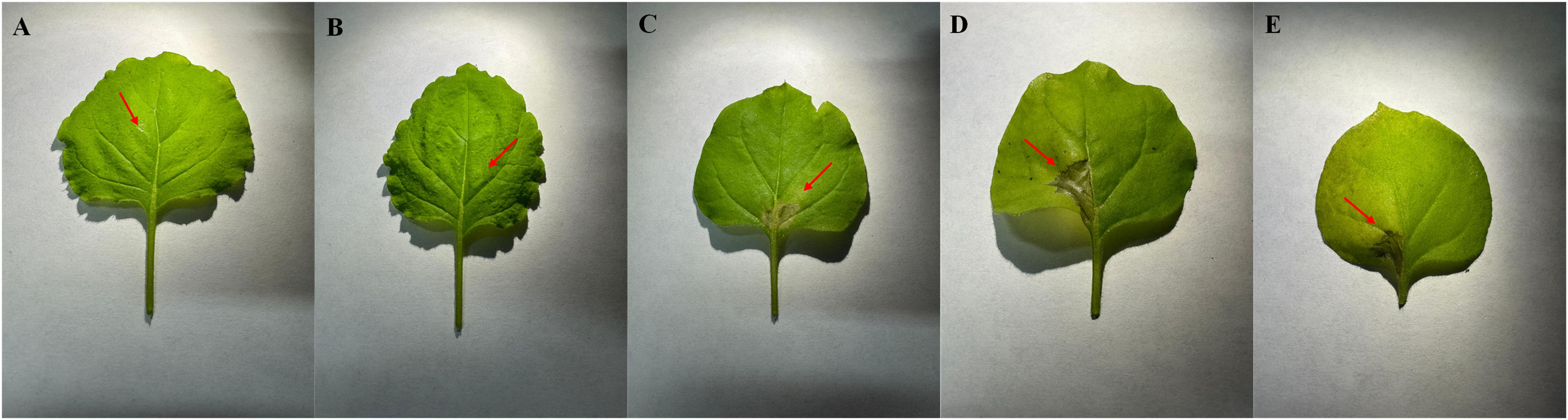 Figure 4. Toxicity assay of Myrtus communis biotype “Tarantino” leaf extract on Nicotiana benthamiana leaves. Treatments: (A) water control, (B) 1,500 ppm, (C) 20,000 ppm, (D) 50,000 ppm, and (E) 100,000 ppm.